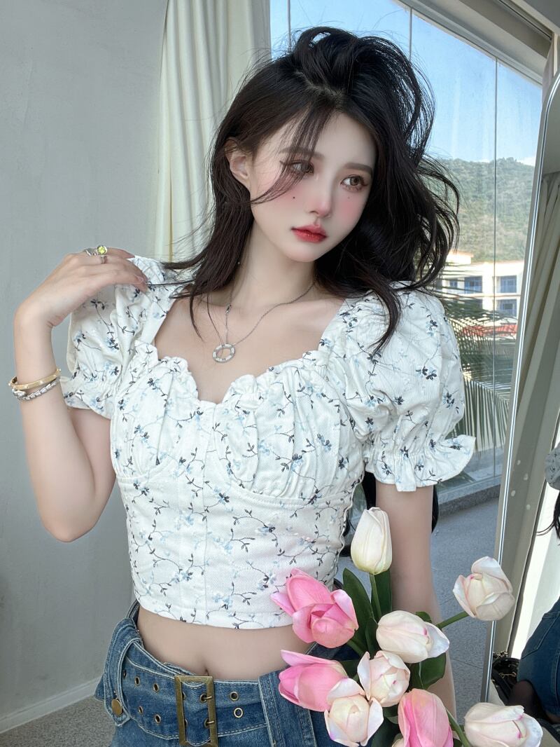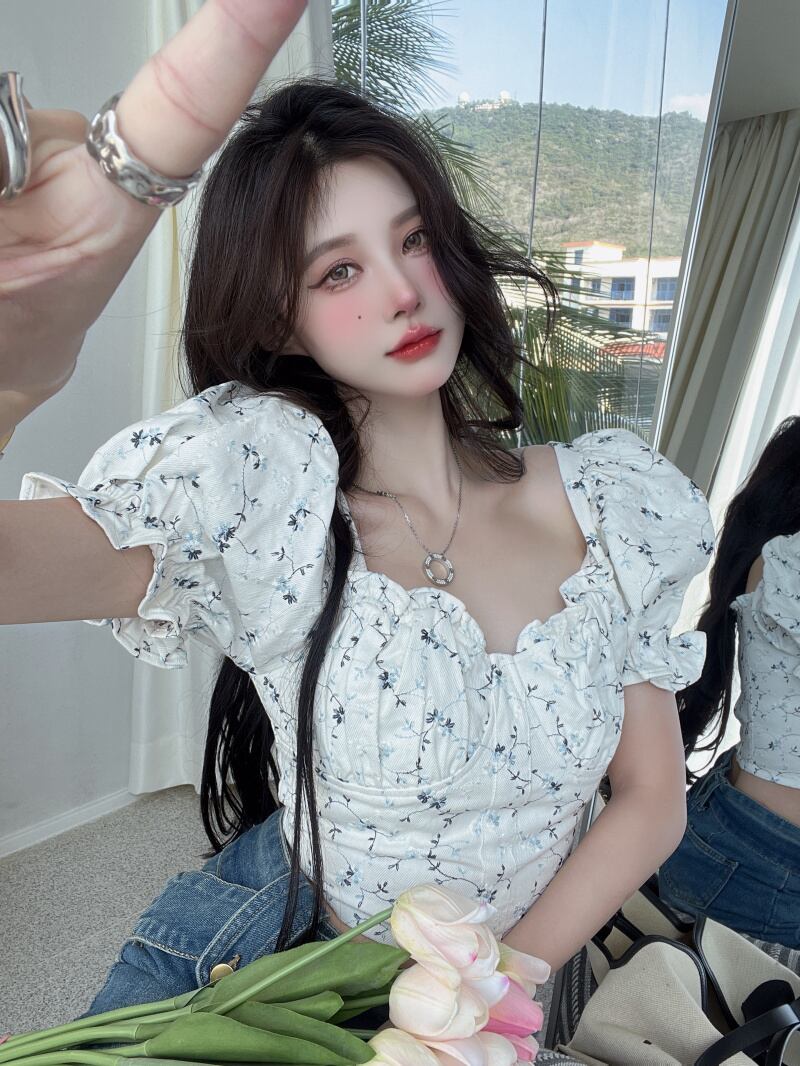 Sweet and spicy style V-neck puff sleeves floral shirt women's summer 2022 new pleated short top trend ショート 大人ガーリー スウィート キュート カジュアル プリーツ サマー 夏物 花柄 Vネック 0921963083963687