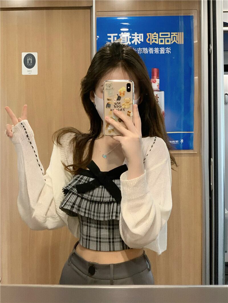 Small chic bow plaid camisole women's outer wear summer 2022 new temperament short top trend ショート リボン サマー 夏物 092198232595633
