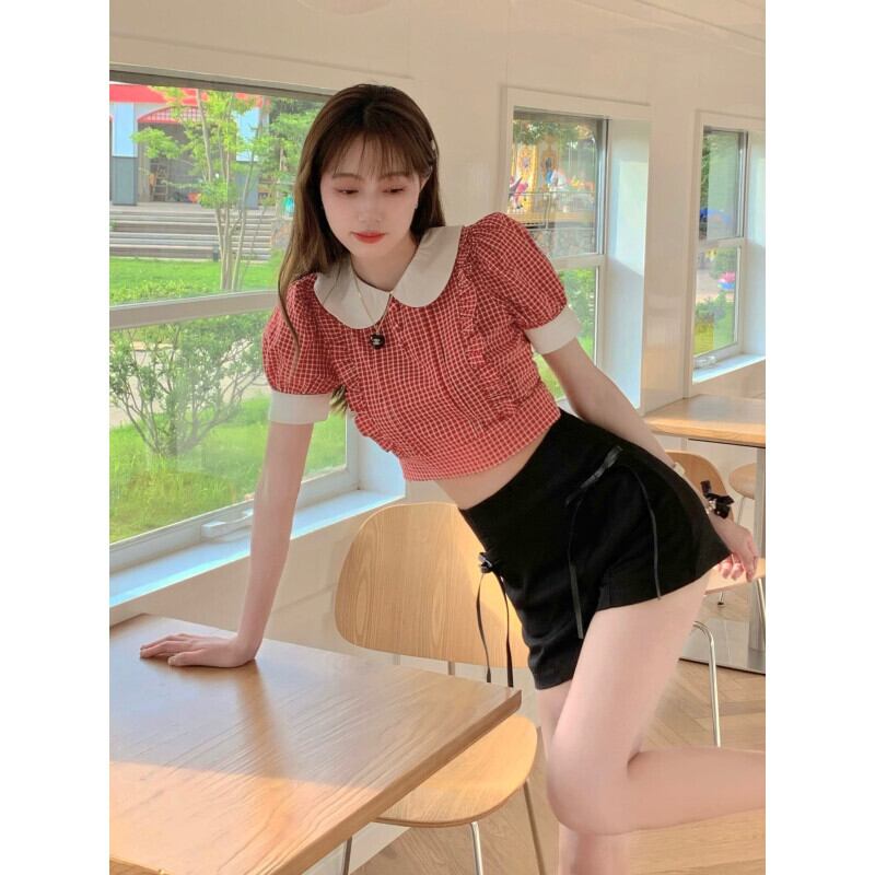 French red plaid puff sleeve shirt women's summer 2022 new design sense fungus edge slim short top ショート レッド サマー 夏物 スリム 092199116522796