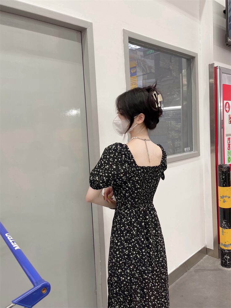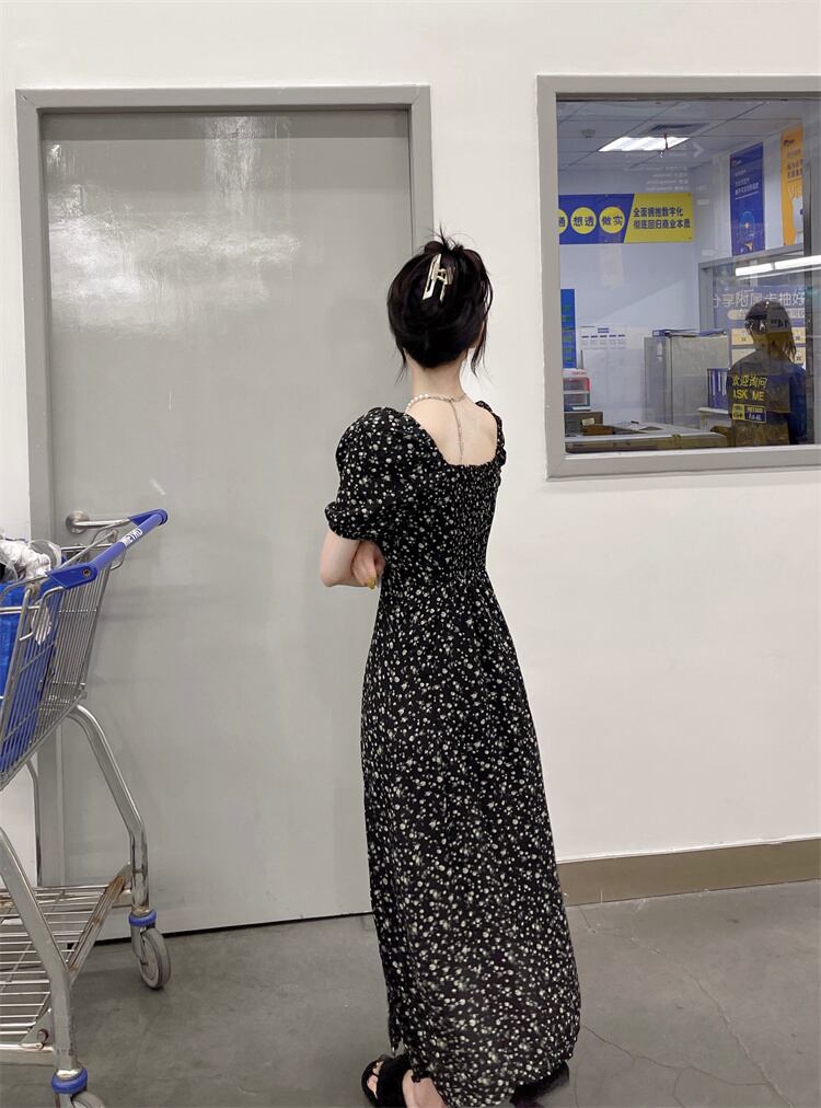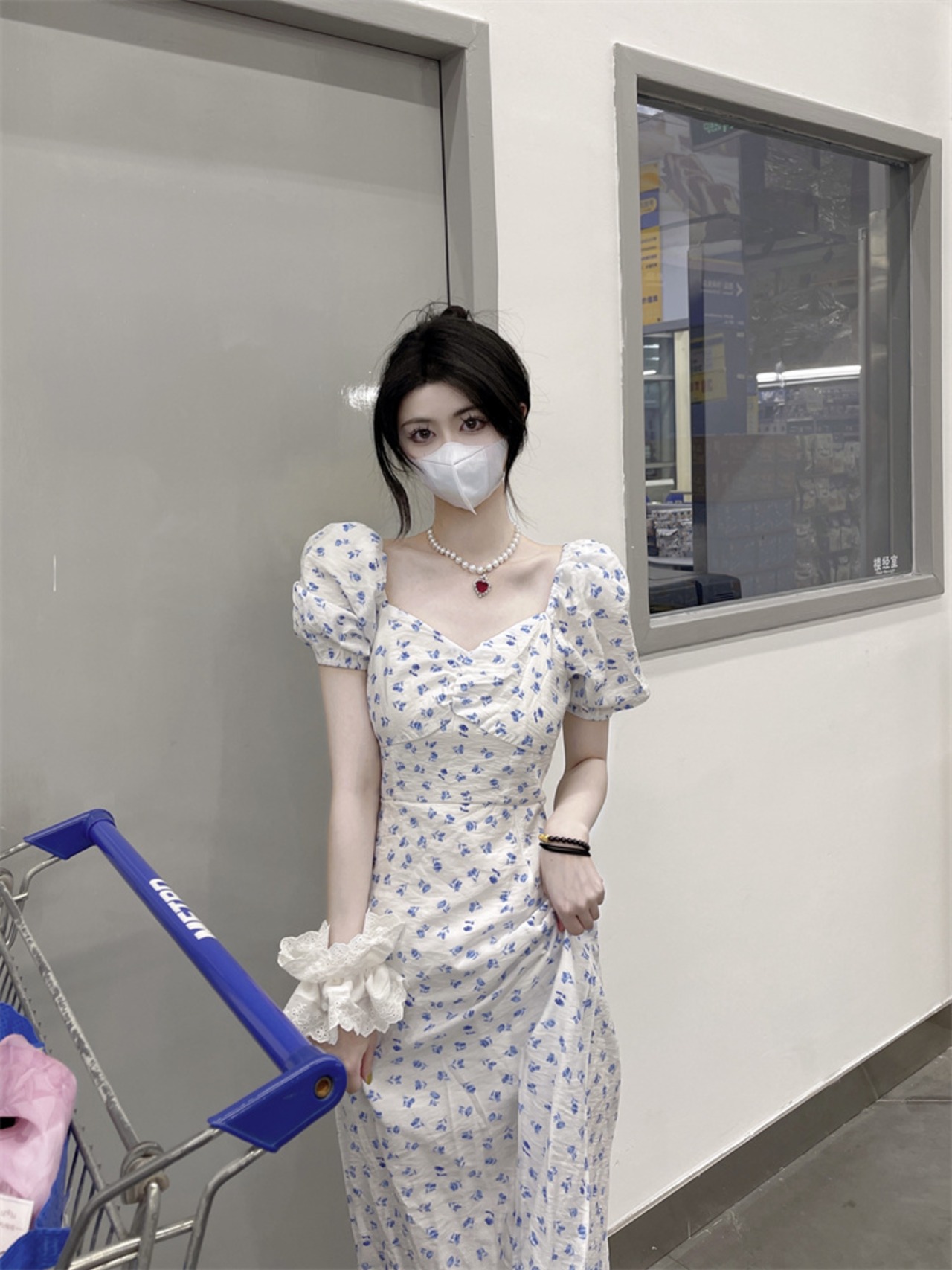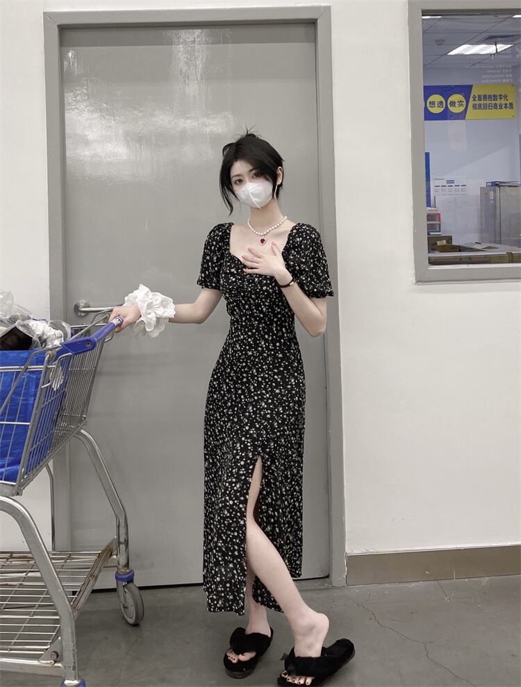 French floral puff sleeve dress women's summer 2022 new temperament V-neck waist mid-length slit skirt サマー 夏物 花柄 スカート Vネック 0921951321154218