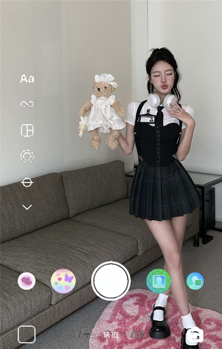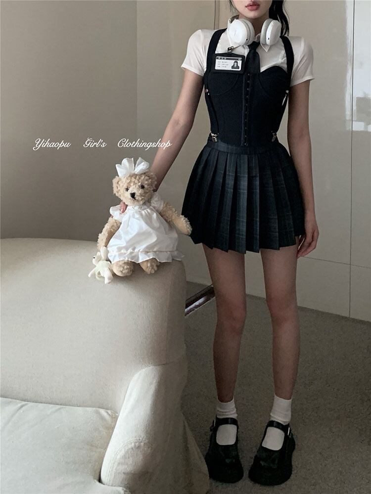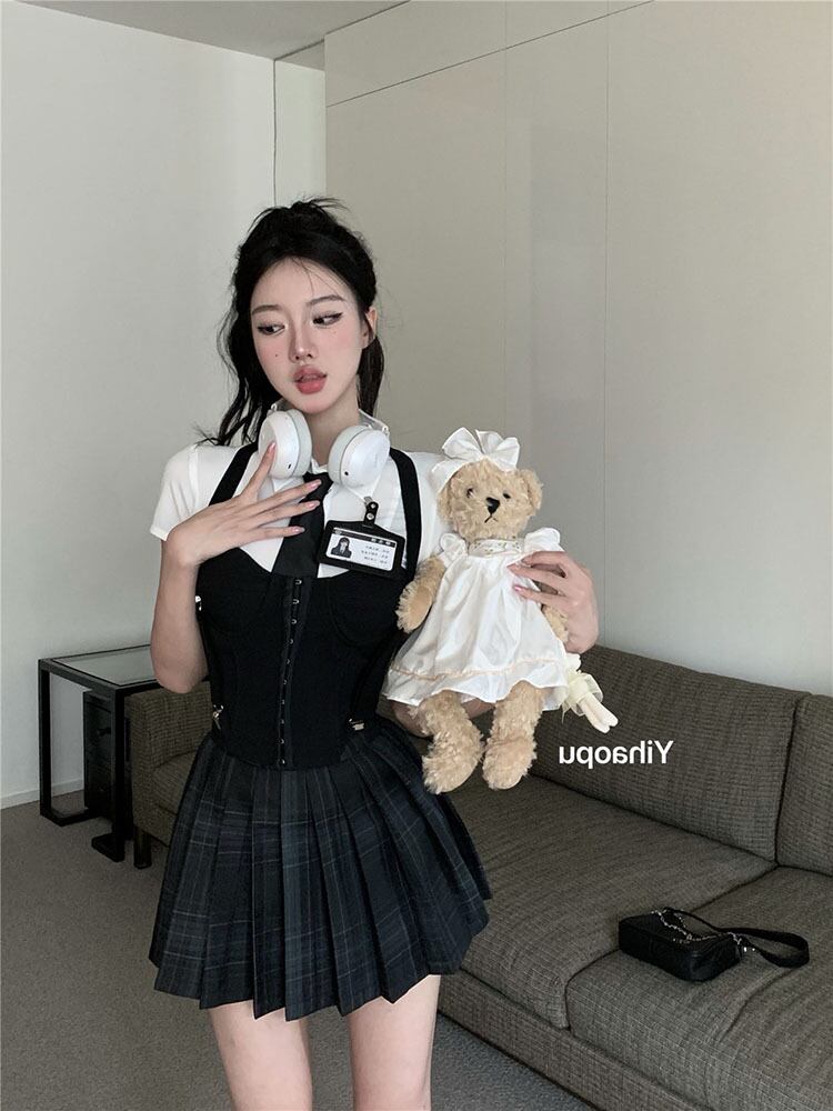 American college style suit female summer 2022 new short-sleeved pure desire fishbone corset pleated skirt three-piece set コルセット プリーツ サマー 夏物 スカート ピュア 0921922725615118