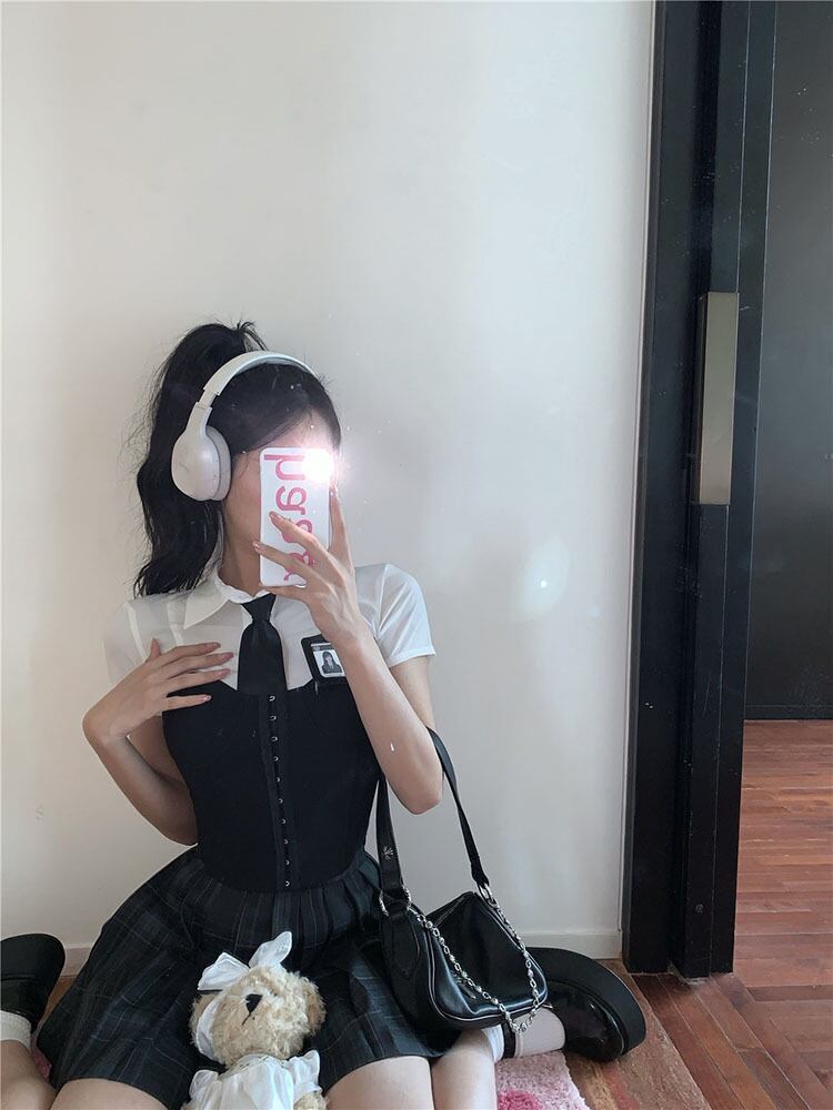 色:Singlepieceofホワイトshirt,チェックスカート,singlepiecefishbワンbra