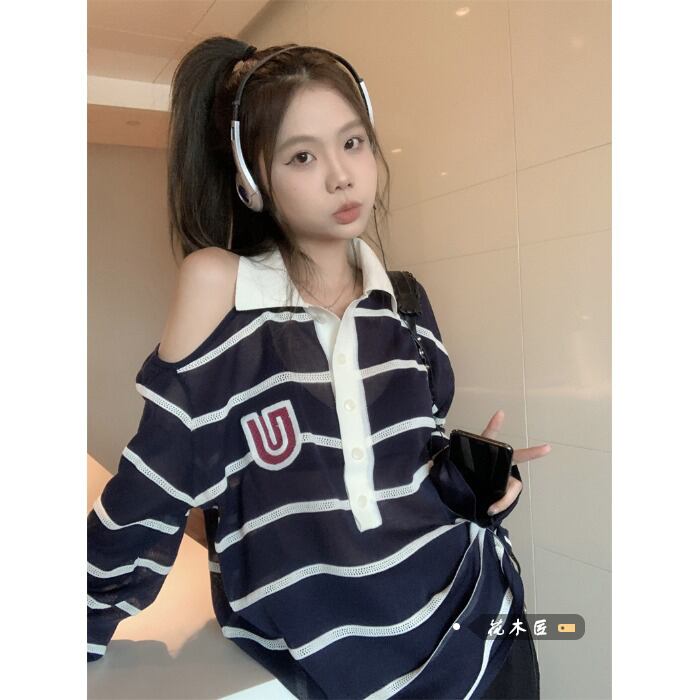 Ghost horse chic off-the-shoulder striped long-sleeved sweater women's summer 2022 new lazy wild loose top ロング サマー 夏物 ストライプ 0921955848884946