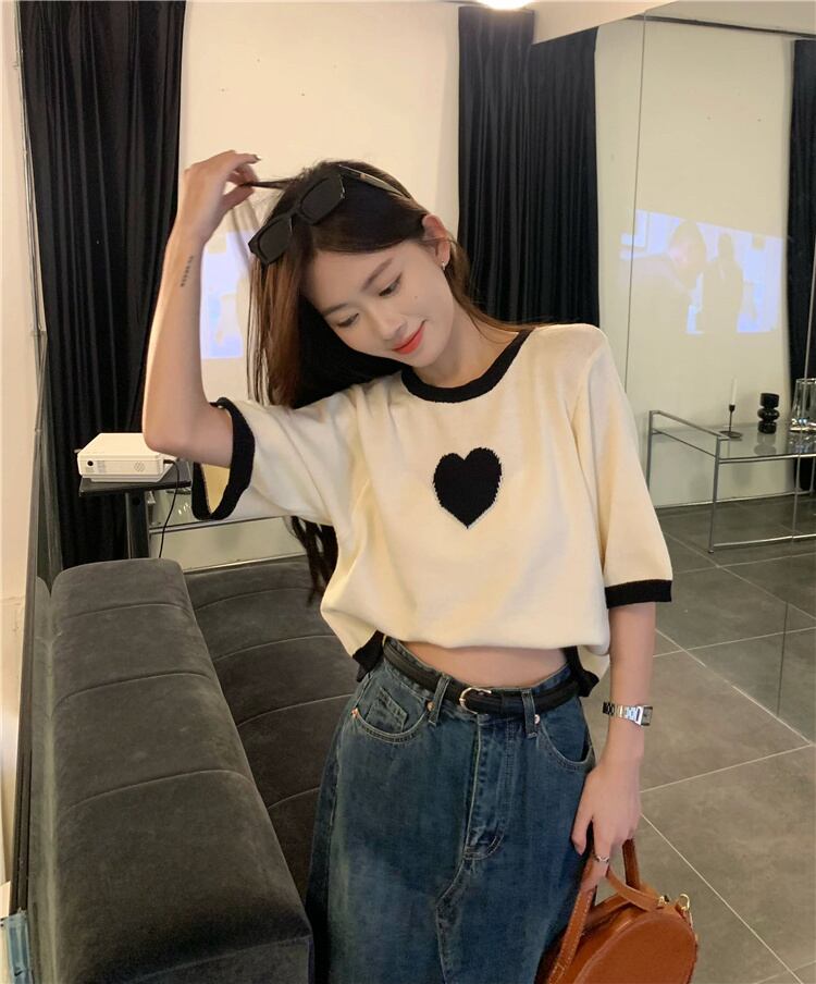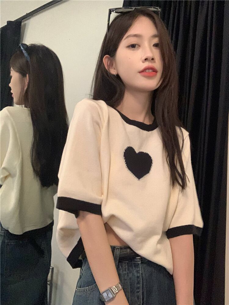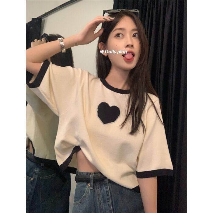 version chic contrast color love half-sleeved knitted T-shirt women's summer 2022 new all-match thin short top ins ショート サマー 夏物 Tシャツ 0921926652741080