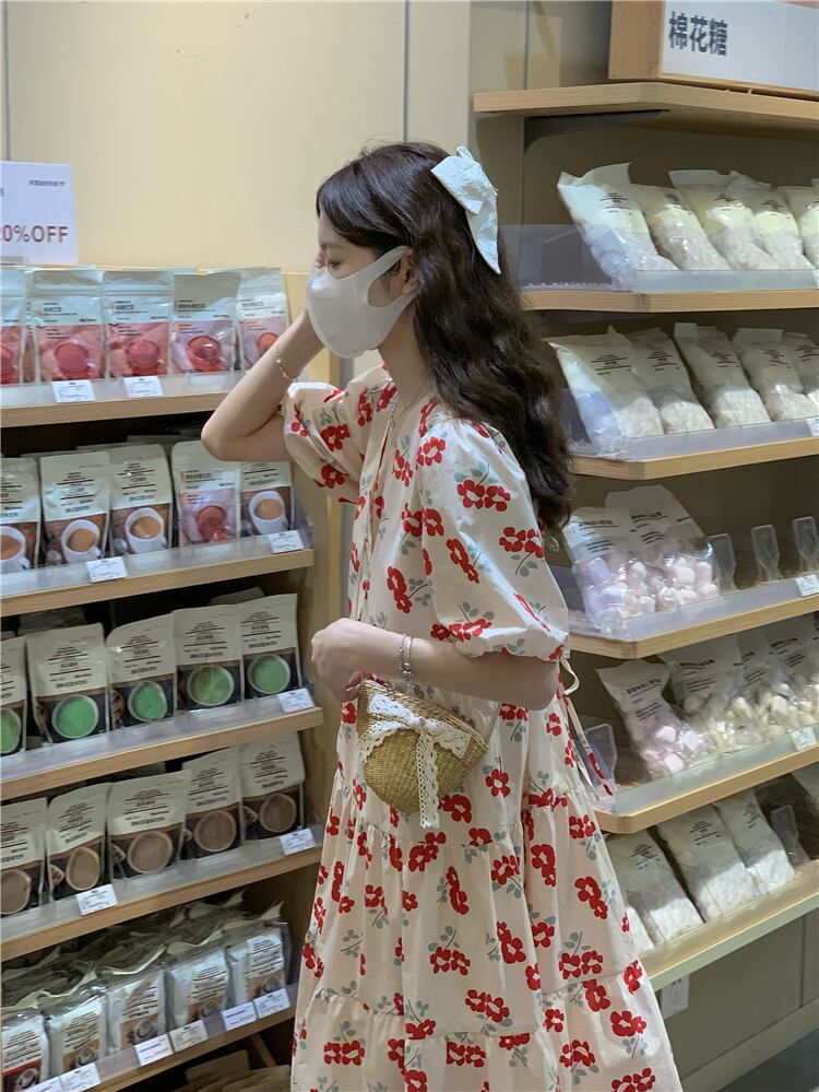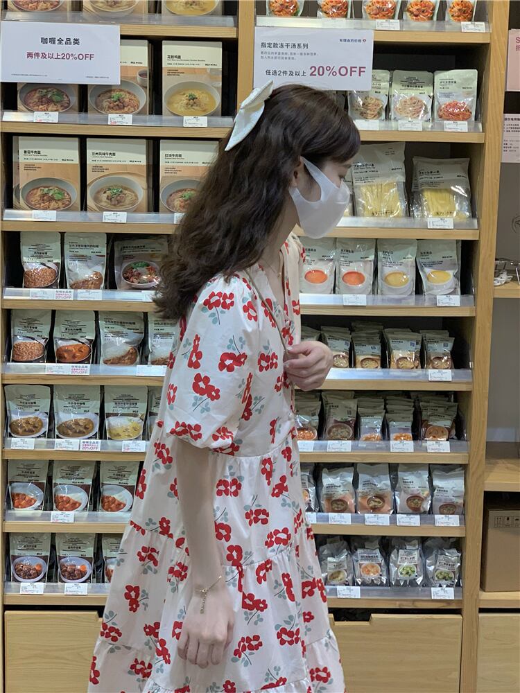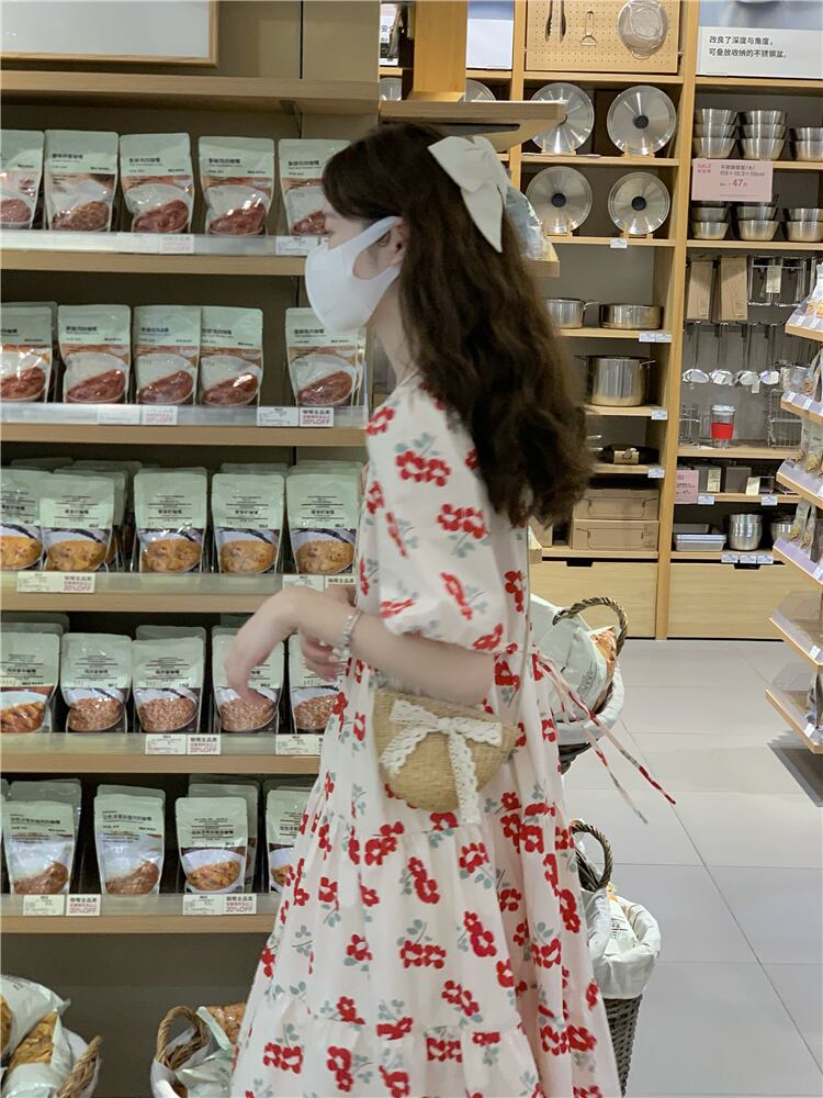 French beautiful lace-up floral dress women's summer 2022 new first love sweet loose and thin A-line skirt ins レース 大人ガーリー スウィート キュート カジュアル サマー 夏物 花柄 スカート Aライン レースアップ 0921980069143219