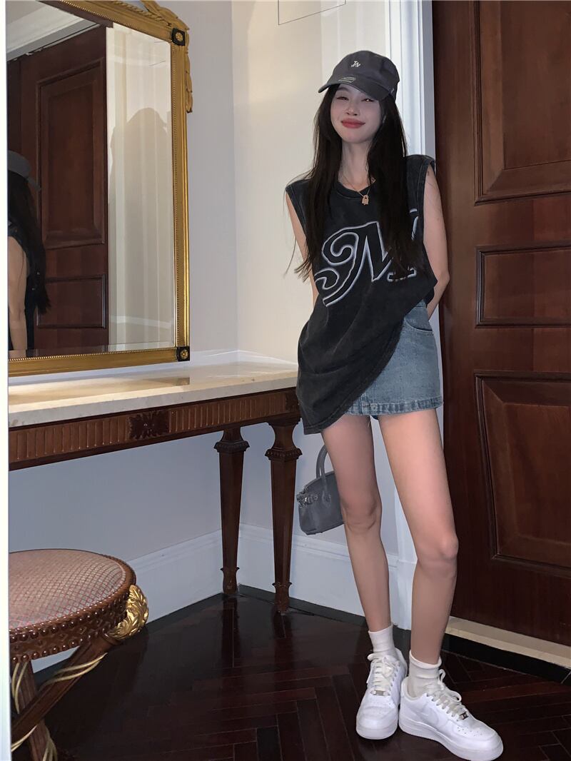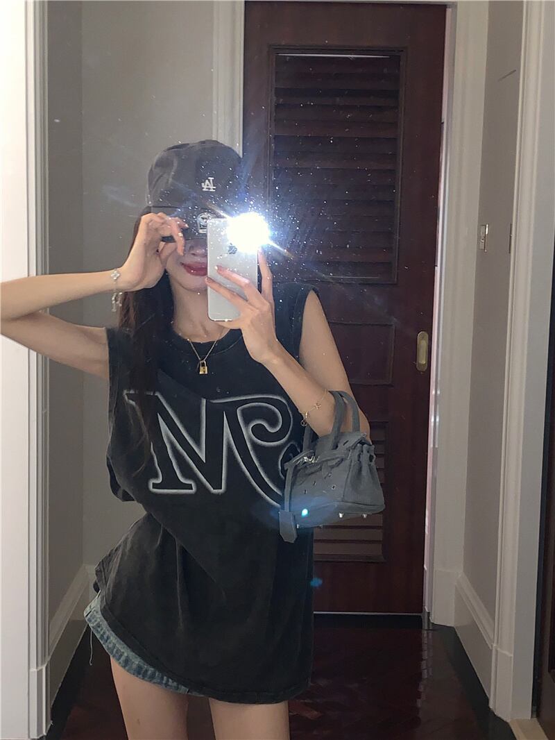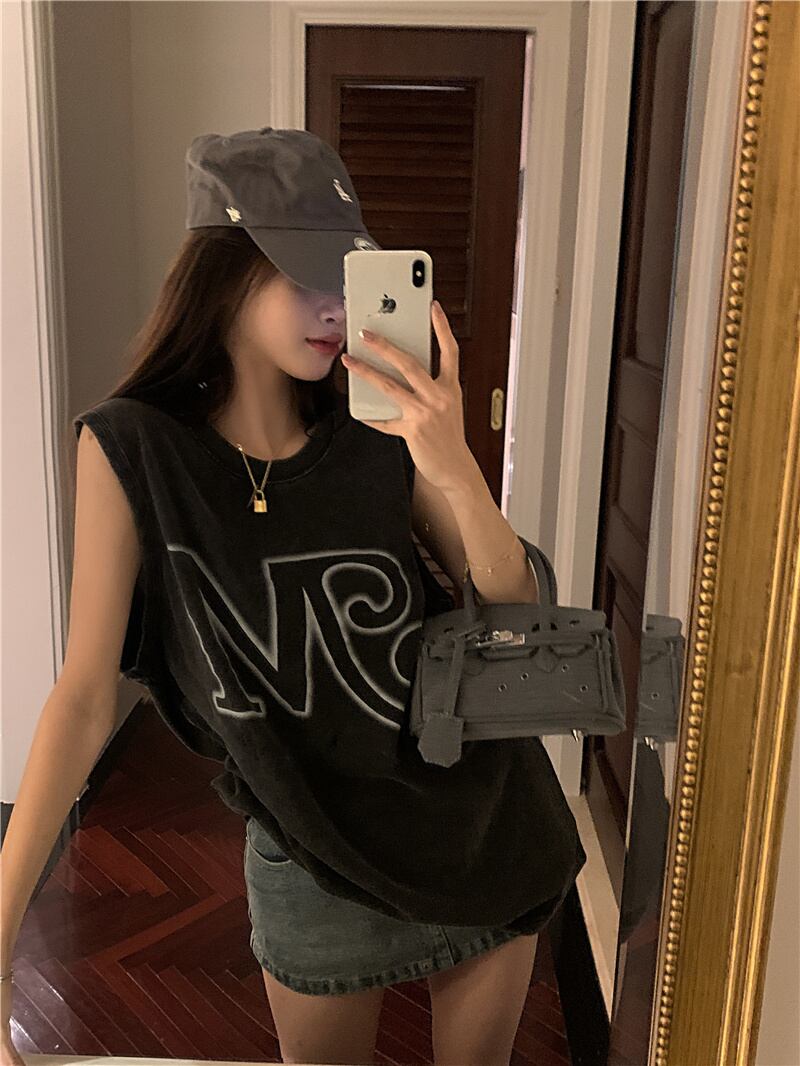 American retro old letter printing sleeveless vest T-shirt women summer outer wear ins loose all-match top レトロ サマー 夏物 ノースリーブ Tシャツ 0921967176705835