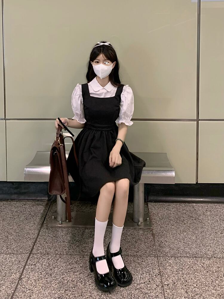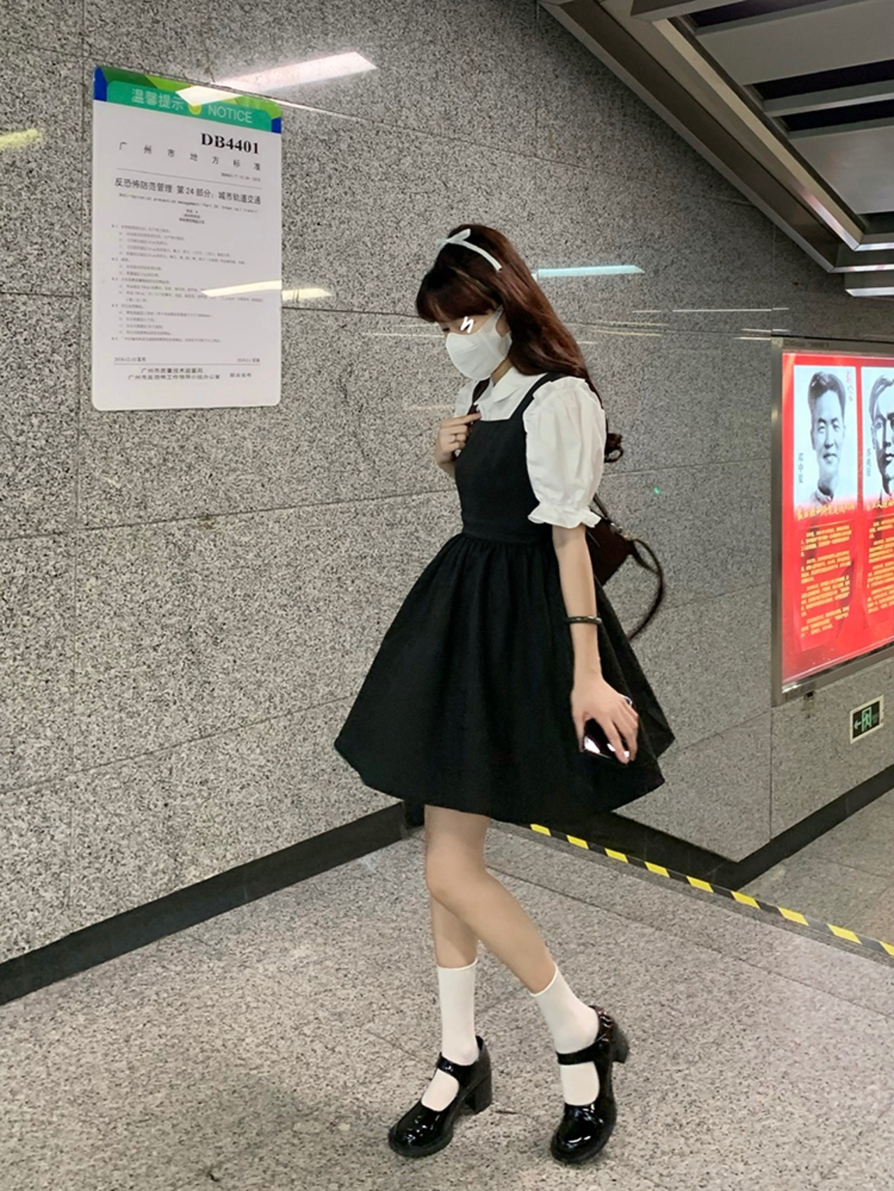 レトロ ガーリー シックな弓黒ストラップ ドレス女性夏 2022 新しい気質ウエスト A ライン スカート ブラック リボン サマー 夏物 Aライン 0921921794619600