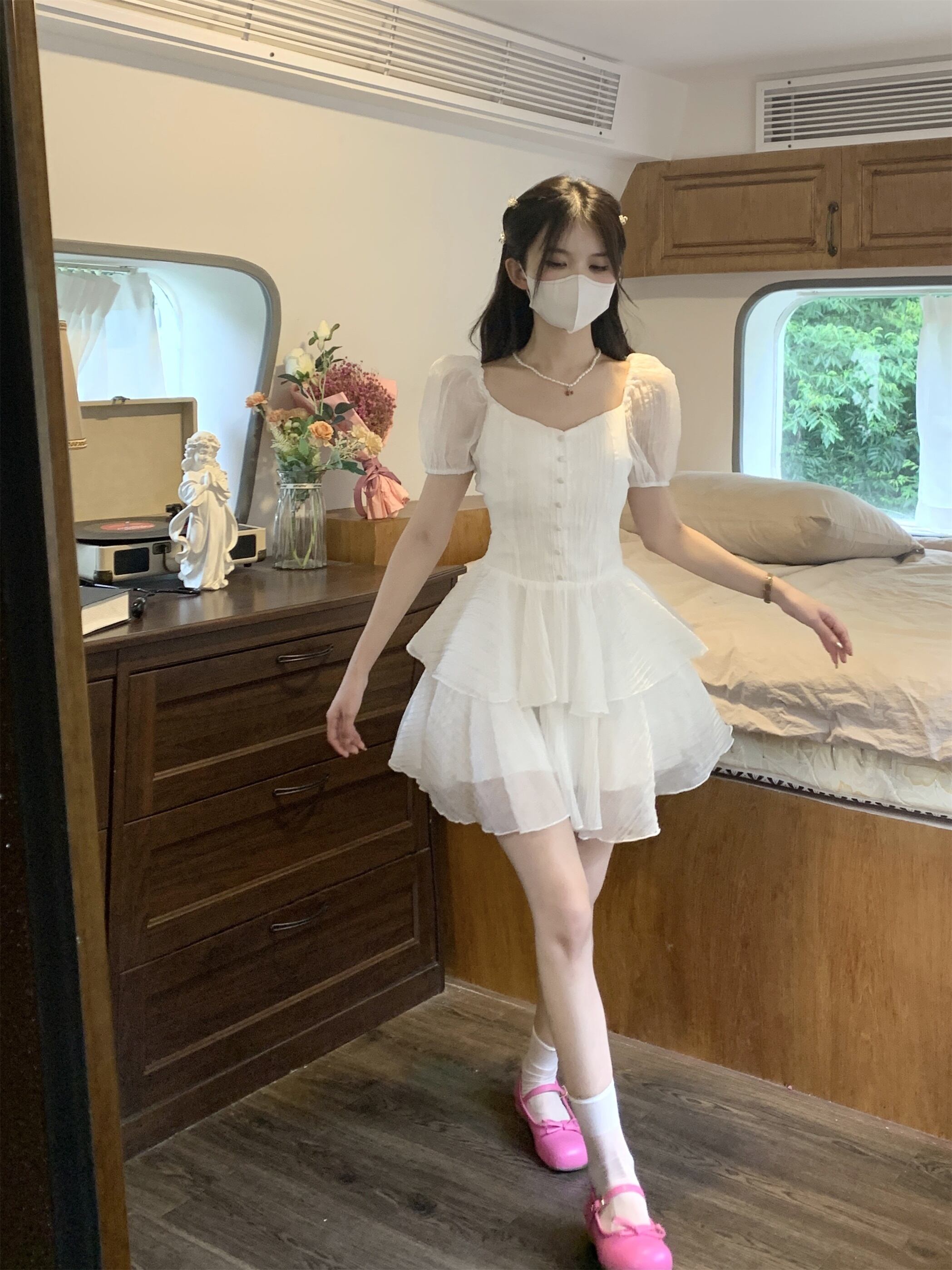 Pure Desire White Puff Sleeve Skirt Women's Summer French Waist Sweet Puff Skirt Sense Small Dress ホワイト 大人ガーリー スウィート キュート カジュアル サマー 夏物 スカート 0921956029716484