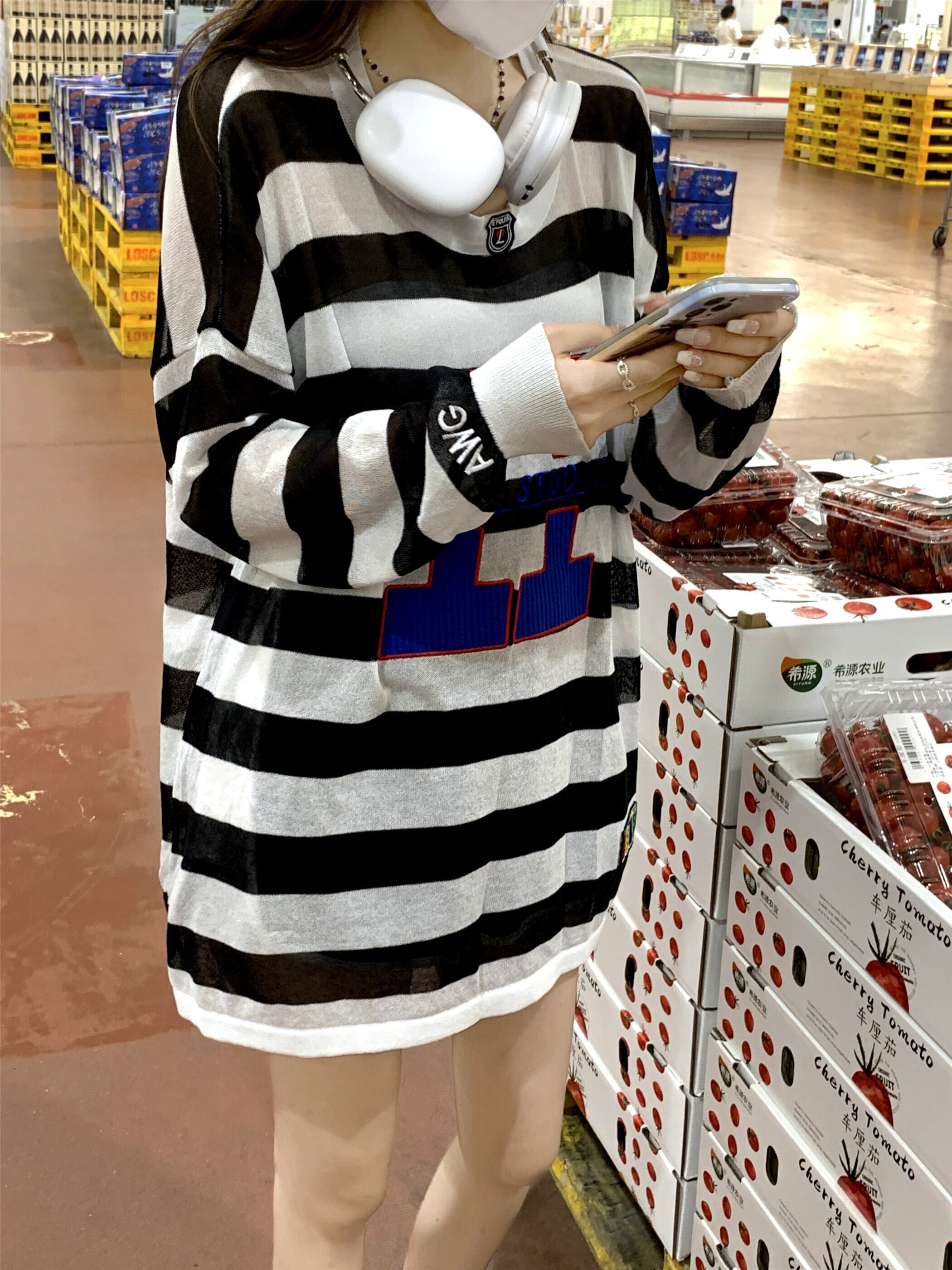 letter embroidery loose and lazy striped T-shirt women's summer new long-sleeved thin sunscreen top ins ロング 刺繍 サマー 夏物 ストライプ Tシャツ 0921959826727160