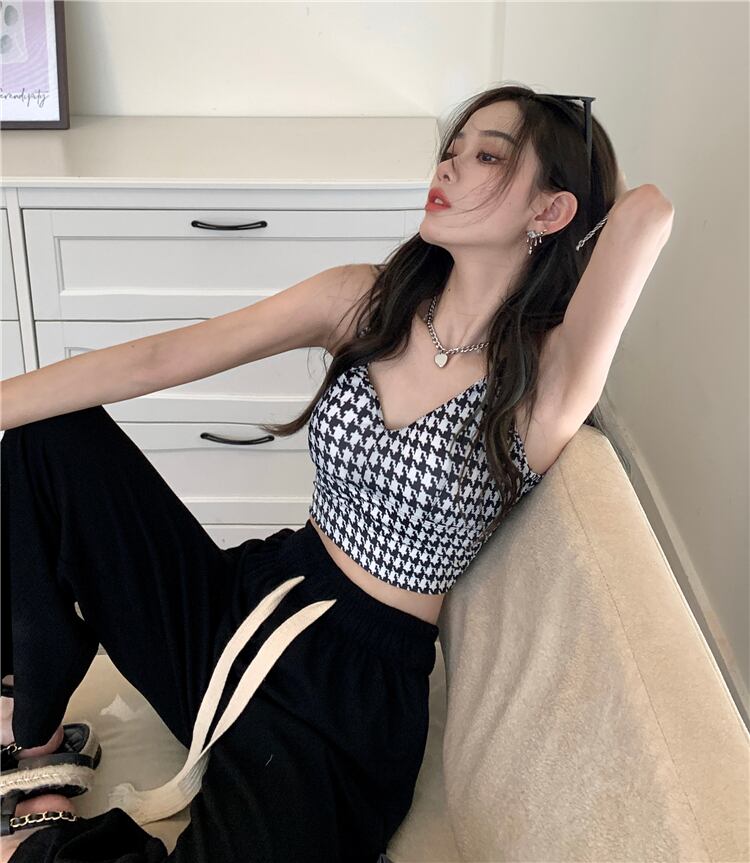 Spice houndstooth camisole female summer outer wear 2022 new design sense inner slim short top trendy ショート サマー 夏物 スリム 0921996947871359