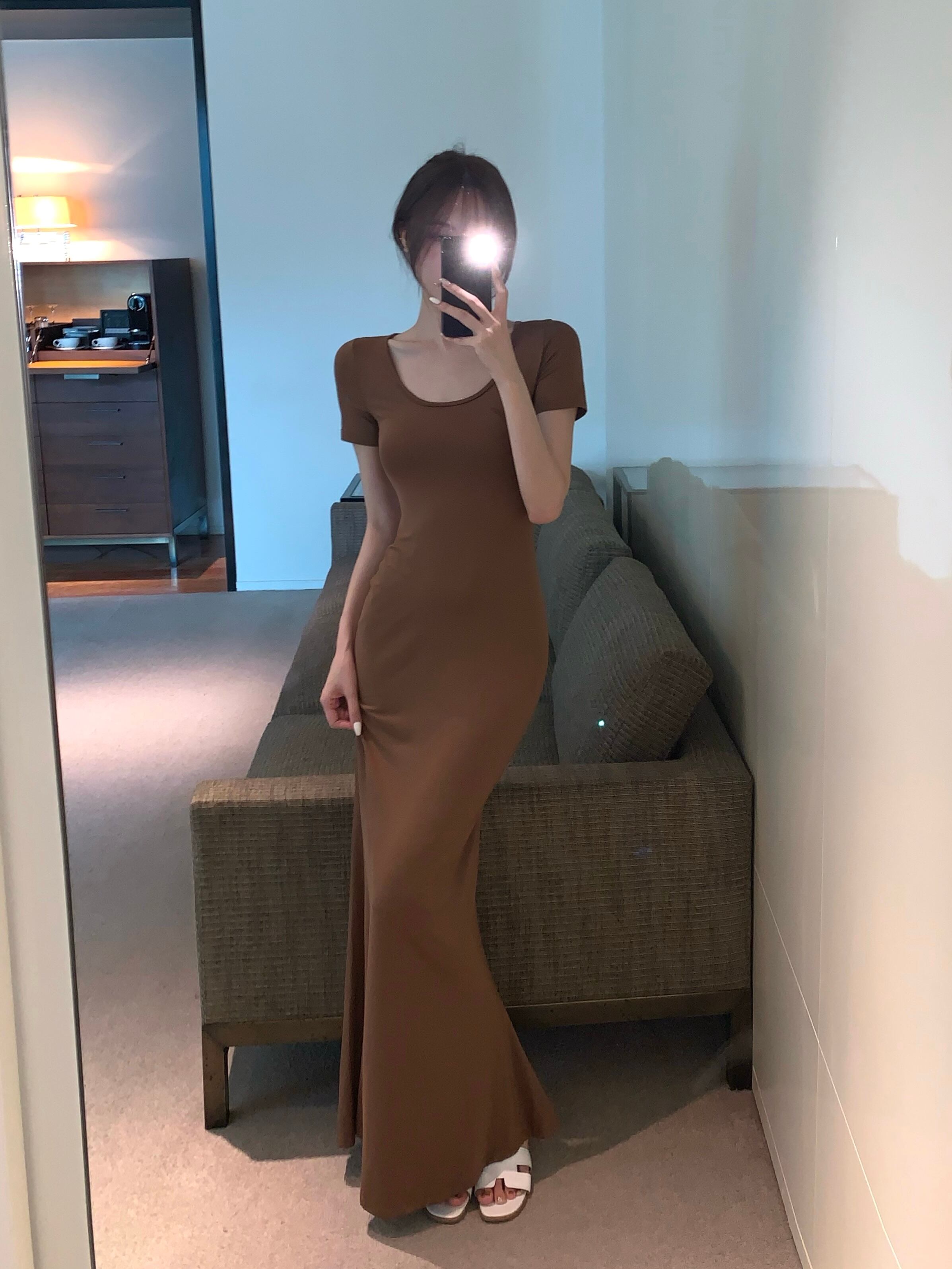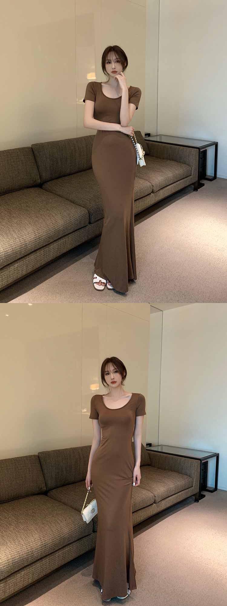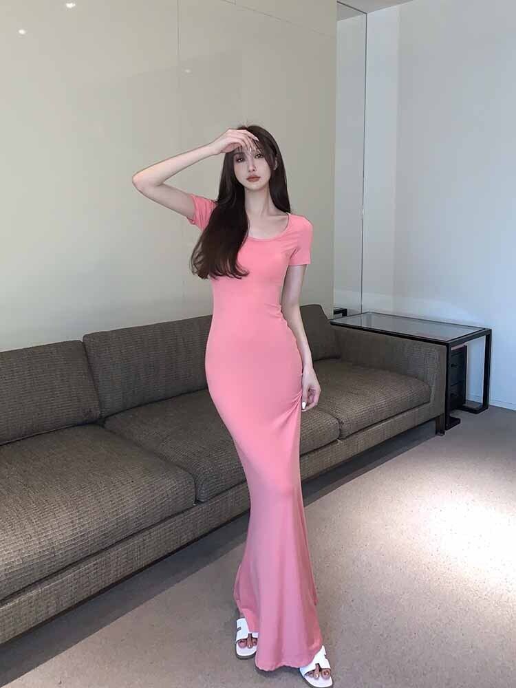 Sexy pink short-sleeved dress women's summer 2022 new temperament round neck waist waist slim slim bag hip long skirt ロング ピンク サマー 夏物 スカート Oネック スリム 0921976338992842