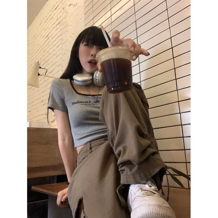 Sweet and cool letter print short-sleeved T-shirt women's summer 2022 new square collar slim fit and thin short top ショート 大人ガーリー スウィート キュート カジュアル サマー 夏物 スリム Tシャツ スクウェア 092196592982417