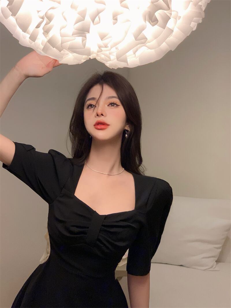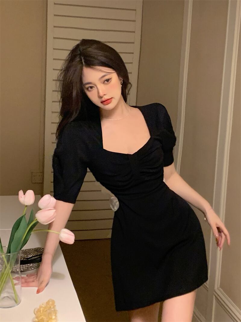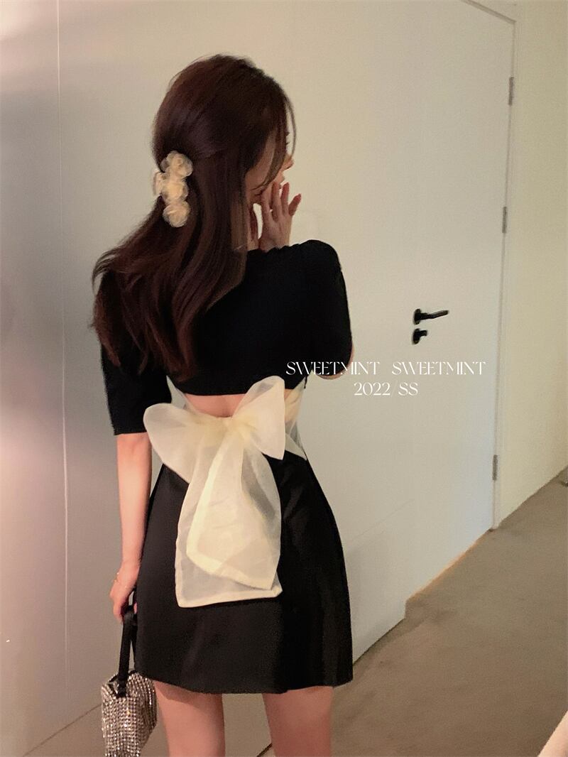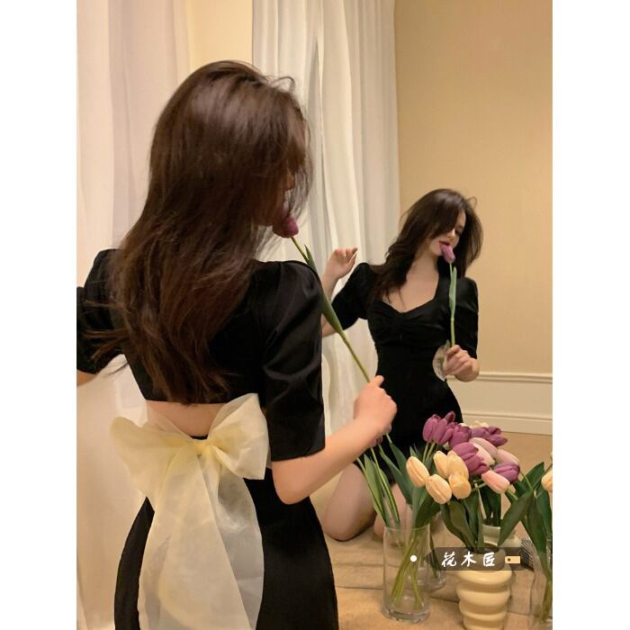 Pure Desire Hot Girl V-neck Puff Sleeve Dress Women's Summer 2022 Bowknot Sexy Back Waist Shower Skirt リボン サマー 夏物 スカート Vネック 092192490009248