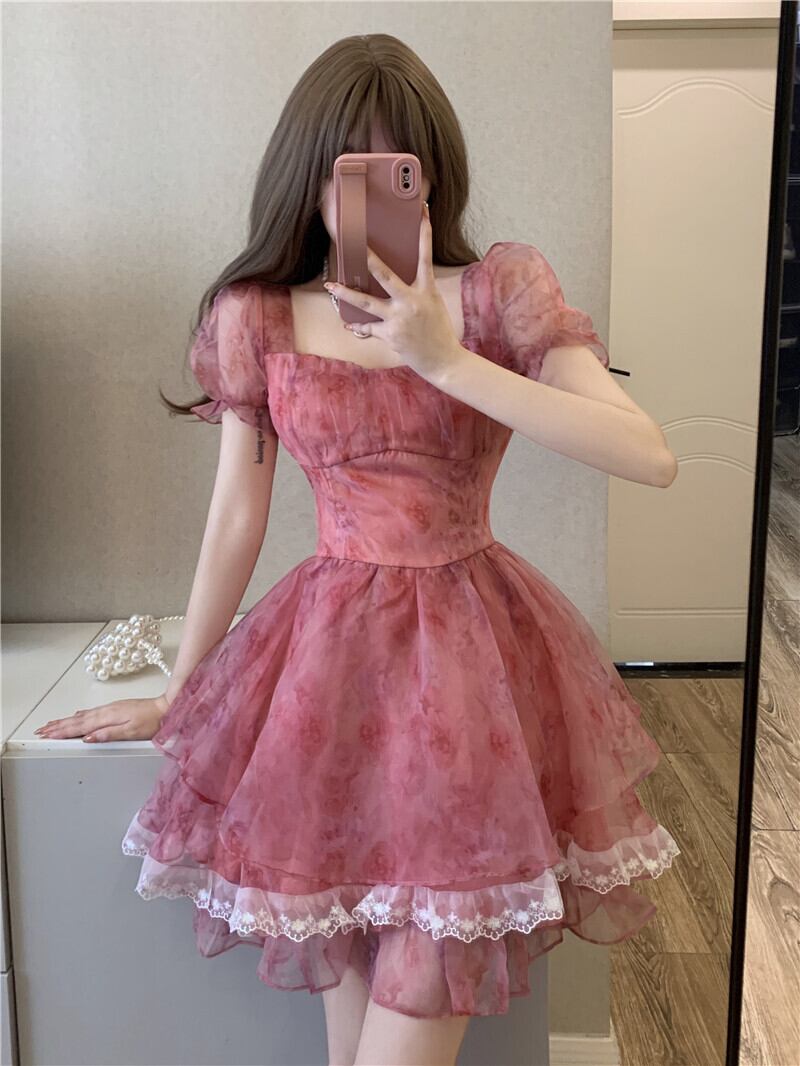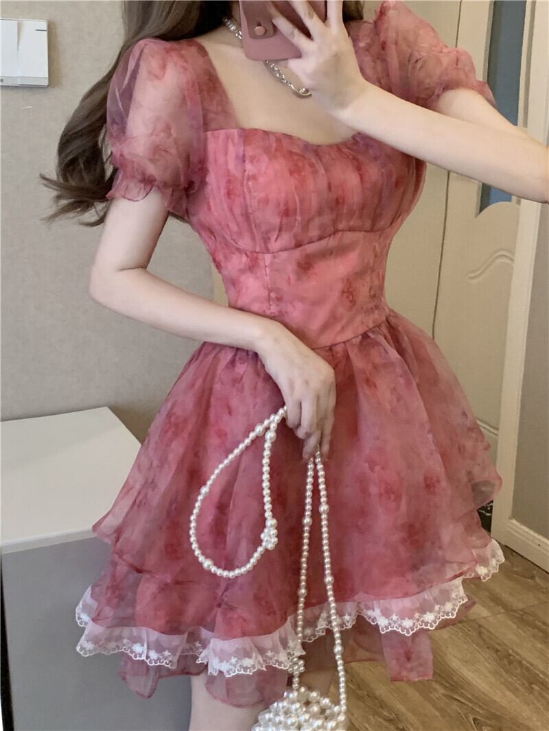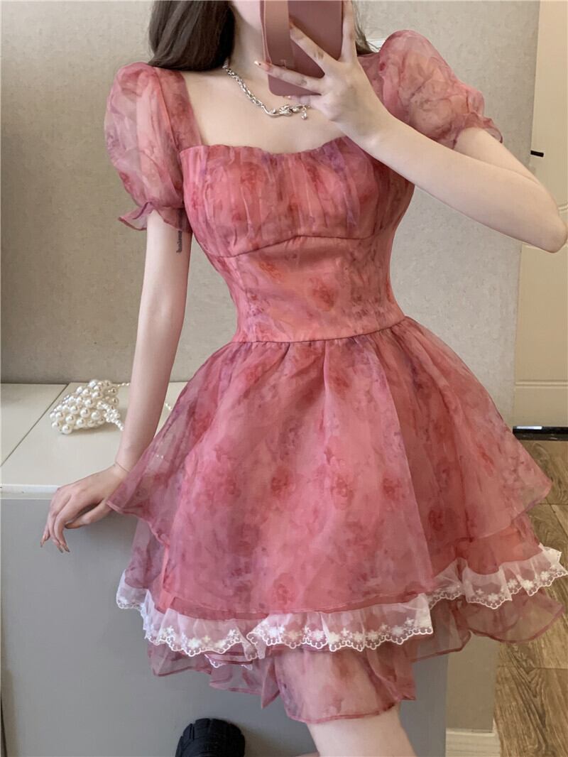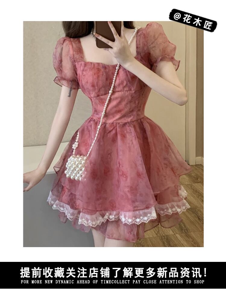 French sweet puff sleeve dress women's summer 2022 new waist slim stitching lace fluffy princess dress レース 大人ガーリー スウィート キュート カジュアル ふわふわ サマー 夏物 スリム ステッチ 0921966636193871