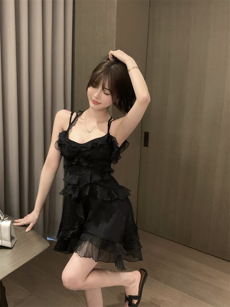 Sexy black halter neck suspender dress women's summer 2022 new chic ruffled waist slim skirt trendy ブラック サマー 夏物 スカート スリム 0921995800238628