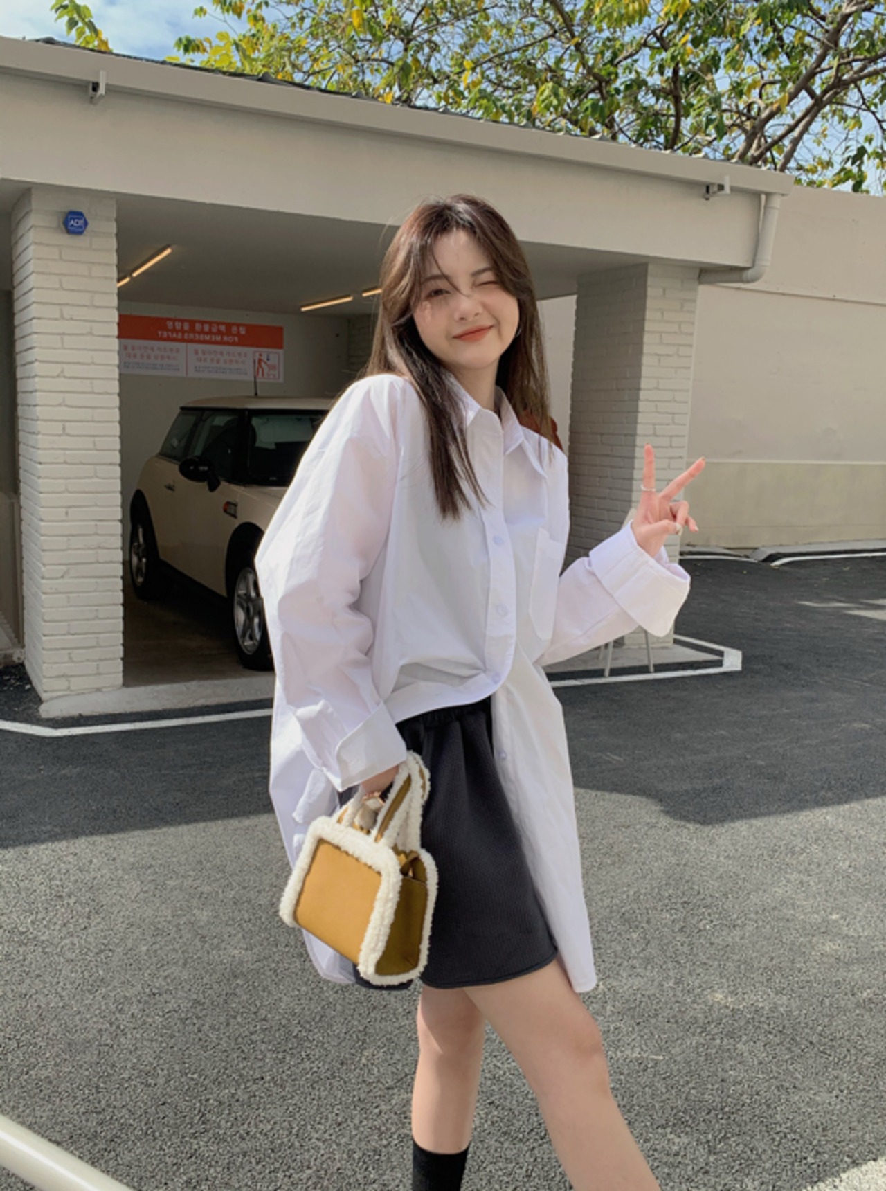 version of the wild bf wind polo collar white shirt women's summer 2022 new chic loose mid-length shirt tide ホワイト サマー 夏物 0921953561911147