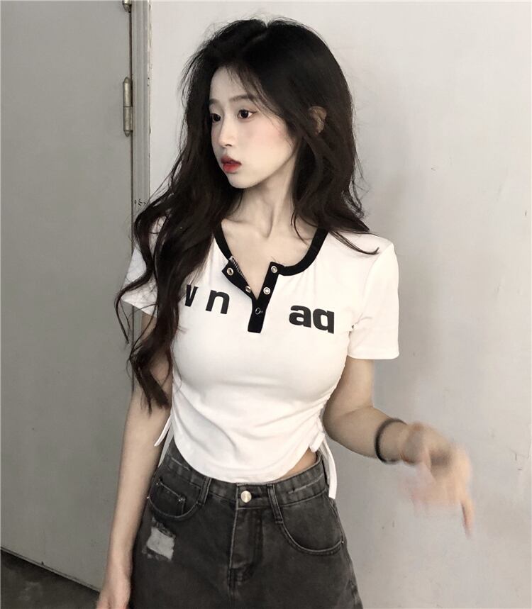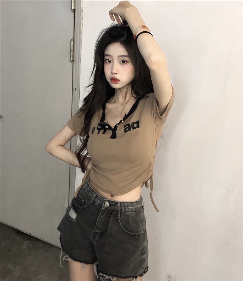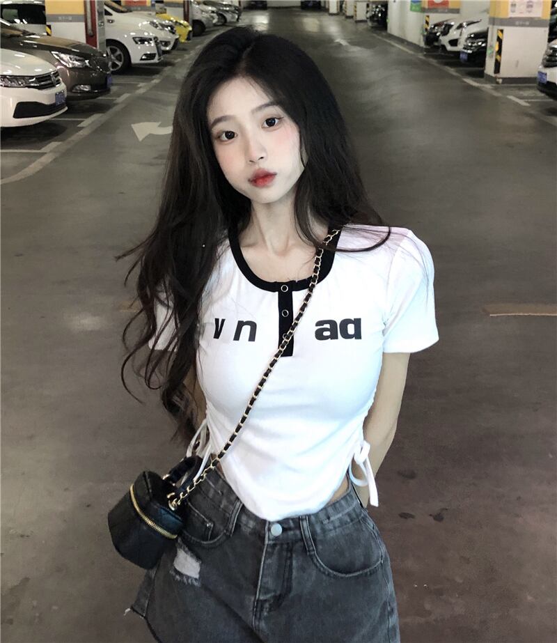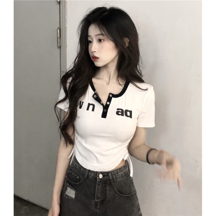 Hot color-blocking short-sleeved T-shirt women's summer 2022 new chic fashion slim chic drawstring short top trendy ショート サマー 夏物 スリム Tシャツ 0921996475254064