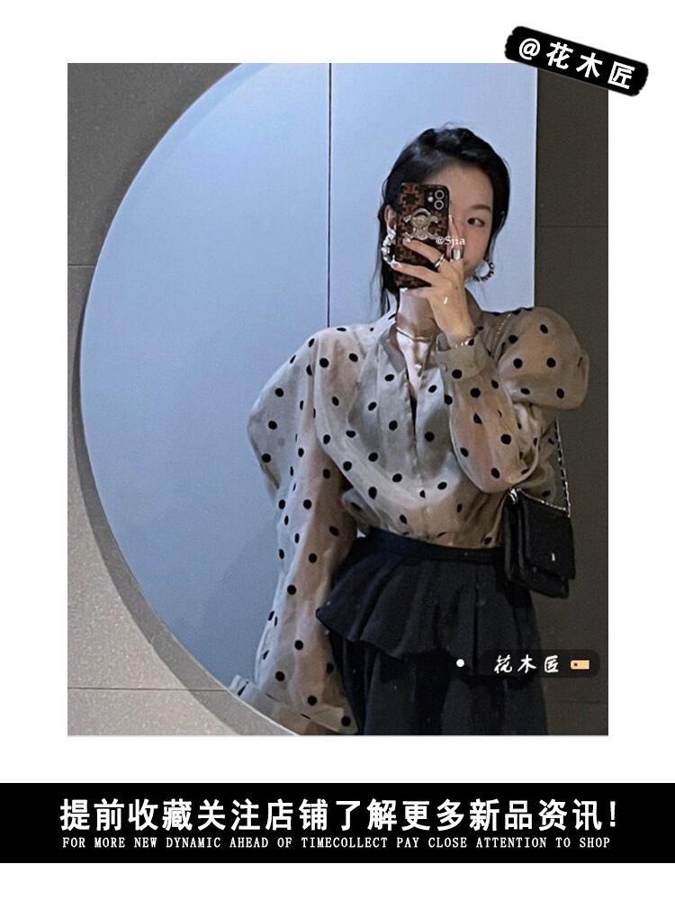chic polka dot chiffon shirt women's summer 2022 new design temperament loose long-sleeved sunscreen top ロング シフォン サマー 夏物 092191664044672