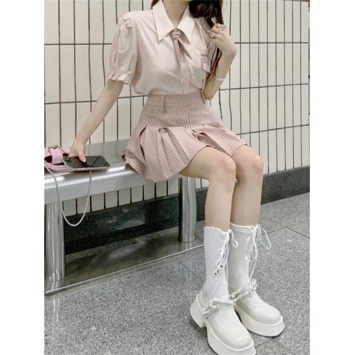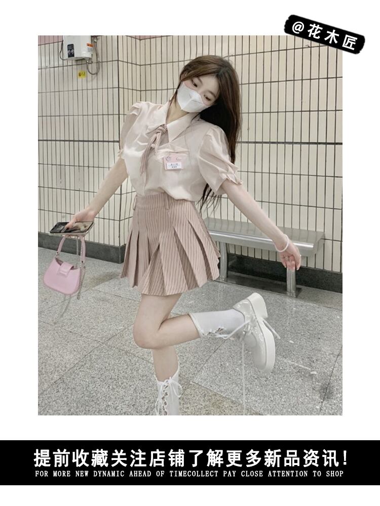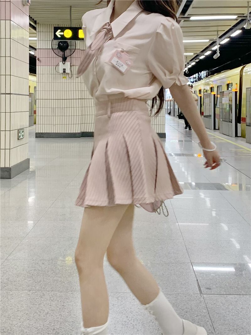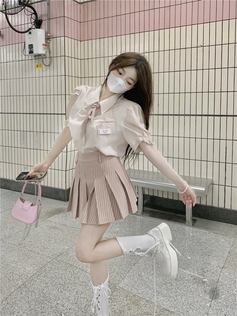 Salty and sweet suit female summer 2022 new pink shirt striped pleated skirt small fashion two-piece suit ピンク 大人ガーリー スウィート キュート カジュアル プリーツ サマー 夏物 スカート ストライプ 0921983295324427