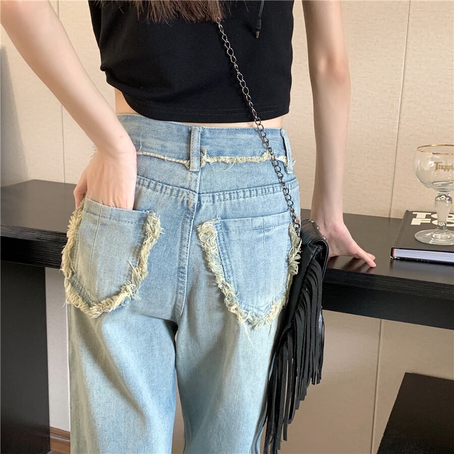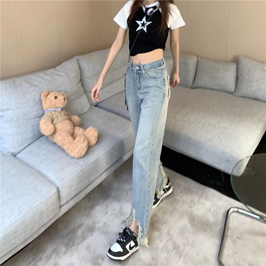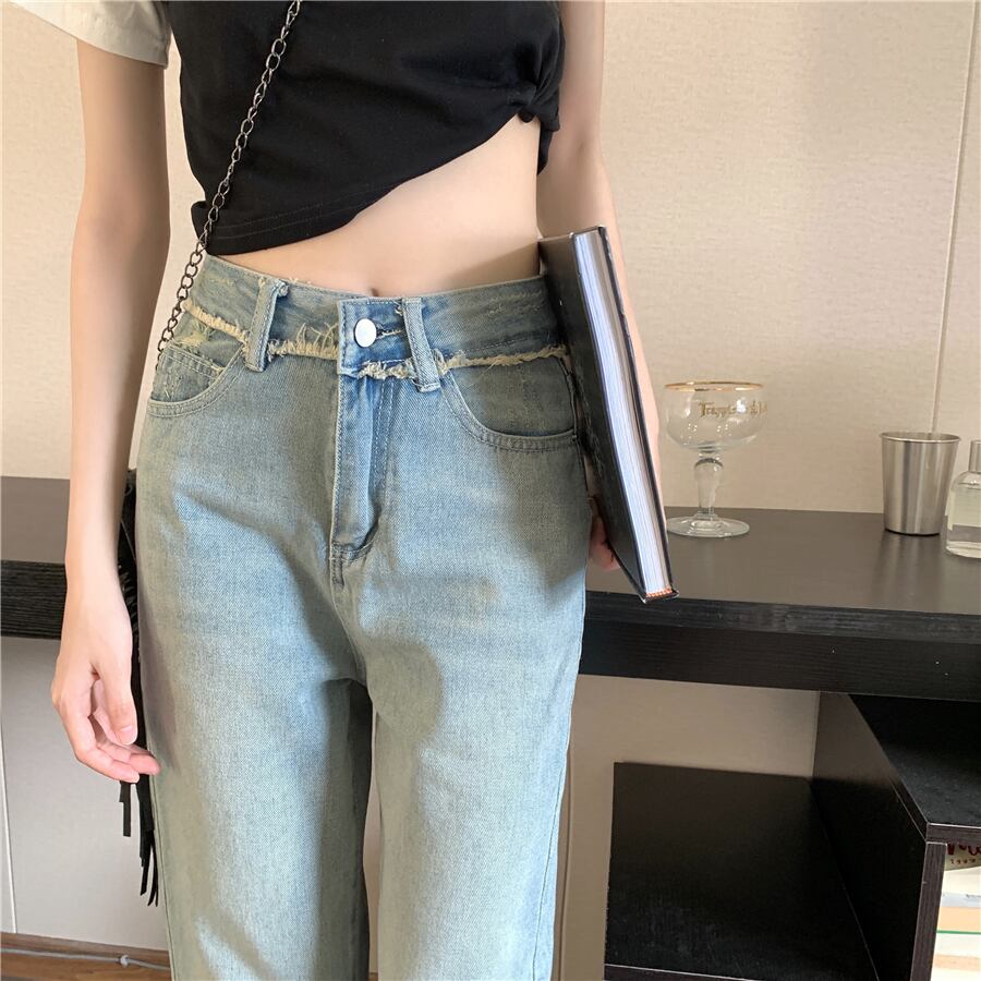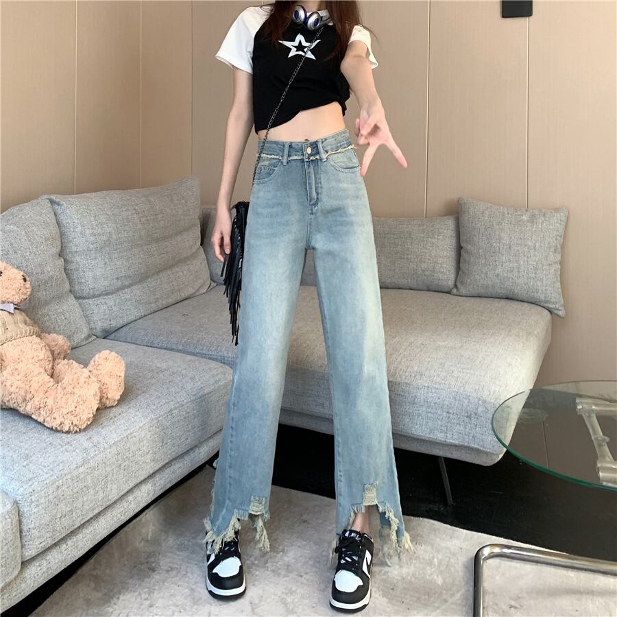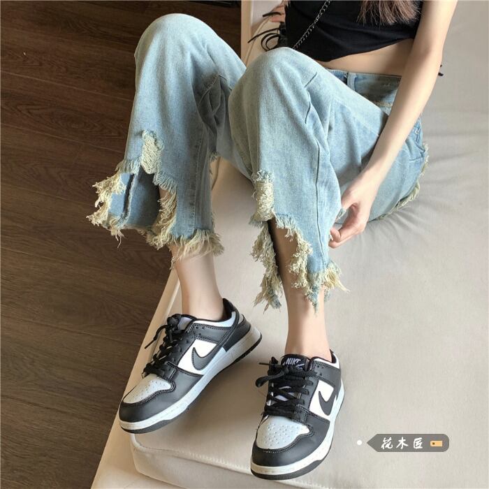 American-style ripped fringed fringed jeans women's summer design niche nine-point pants high-waisted thin wide-leg pants サマー 夏物 0921946649166290