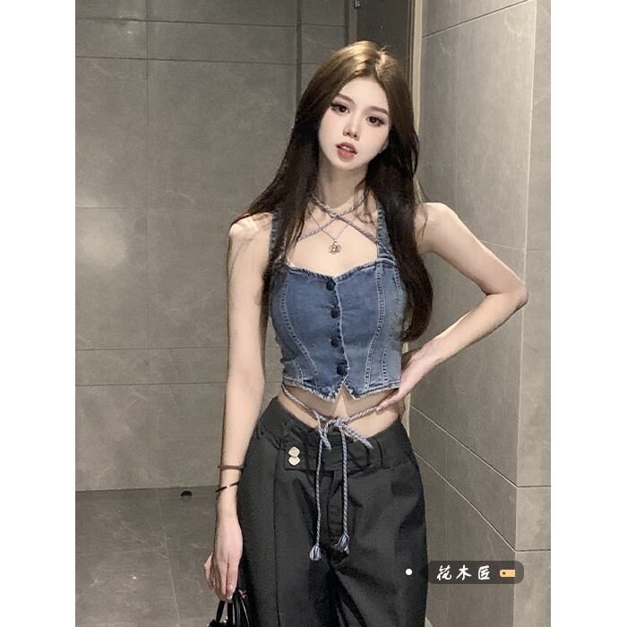 Pure desire wind design sense denim camisole women's summer 2022 new slim fit and thin short sweet and spicy top ショート 大人ガーリー スウィート キュート カジュアル サマー 夏物 スリム 0921951788340565