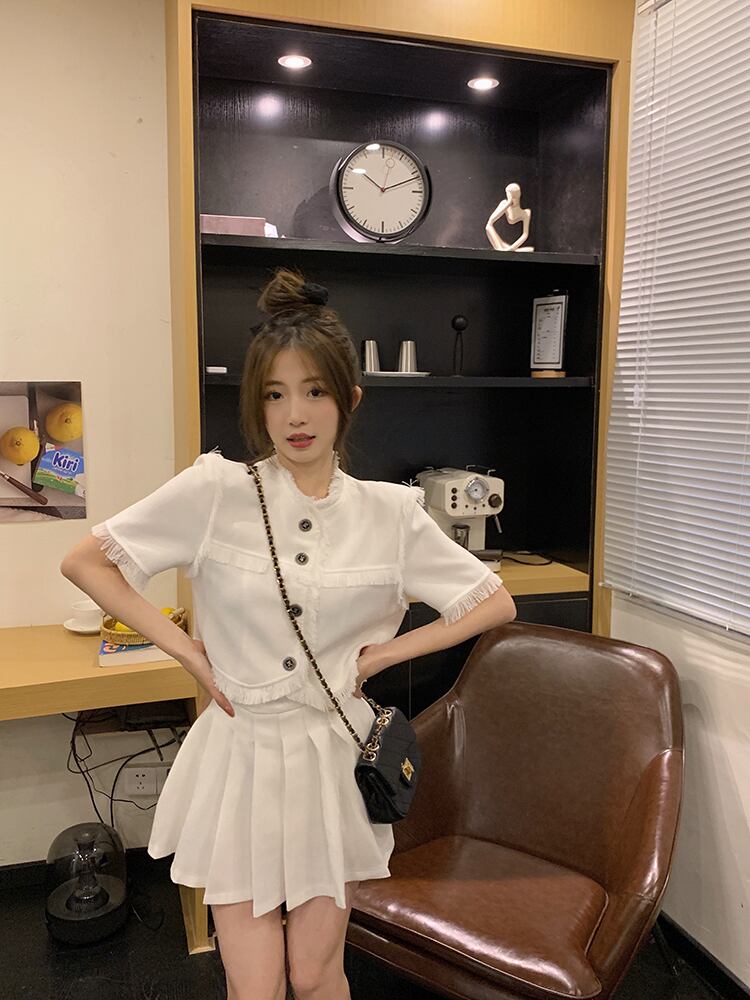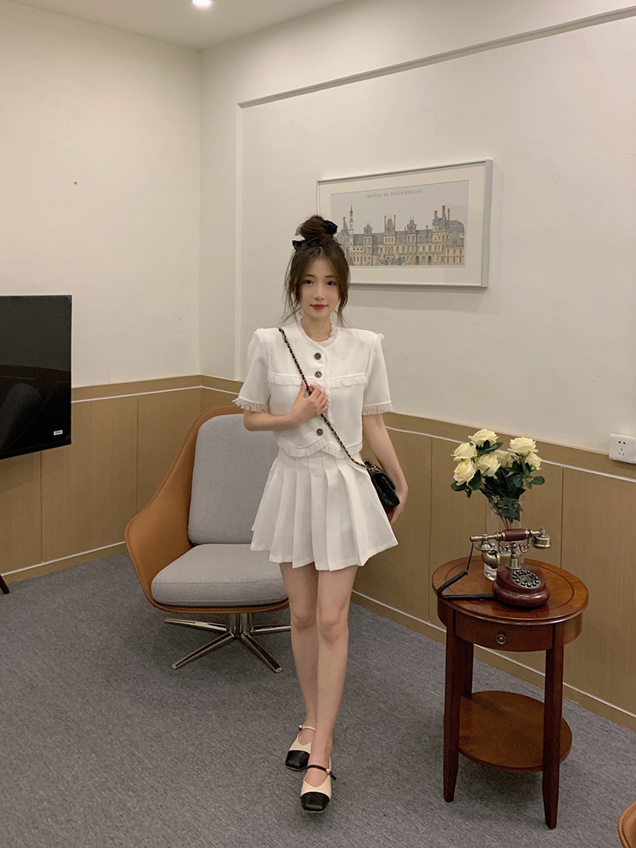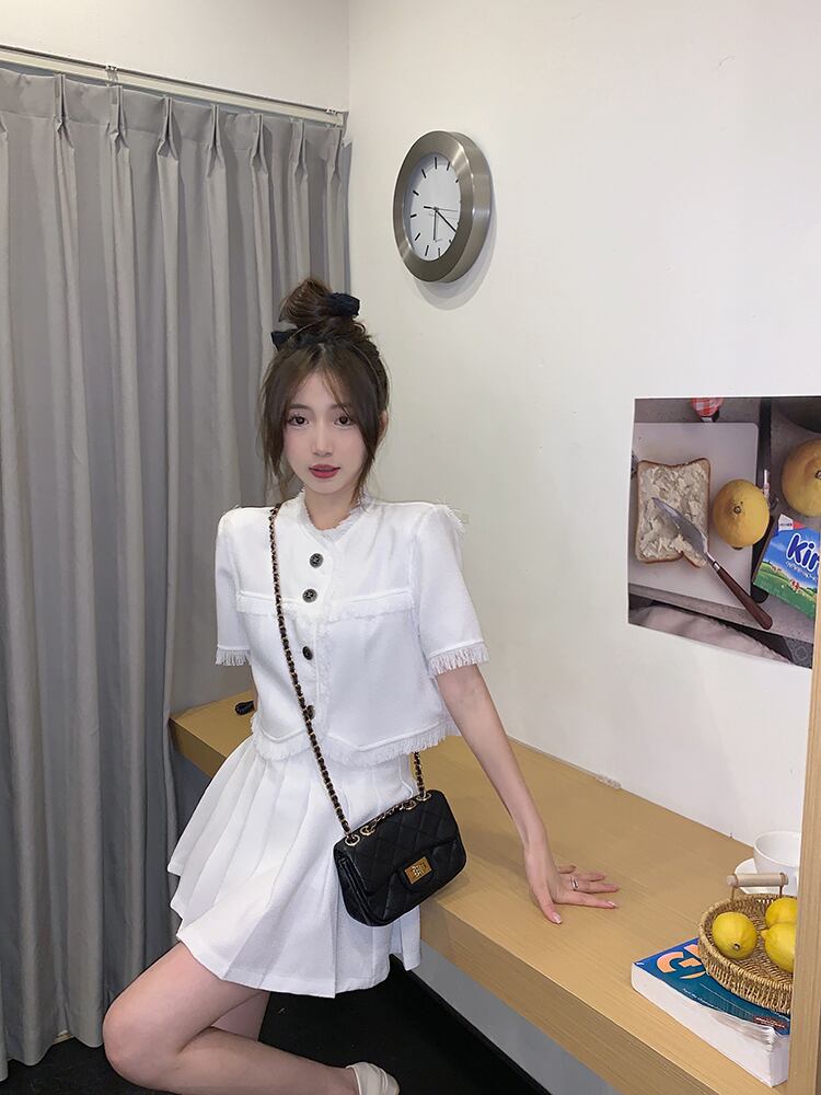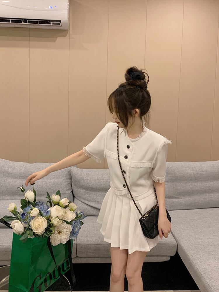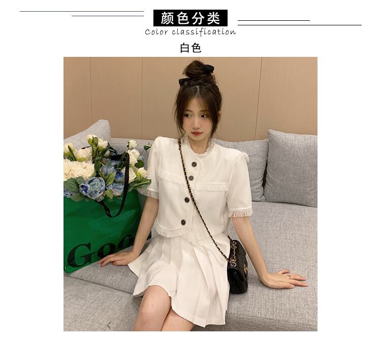 White small fragrance suit female summer 2022 new tel short-sleeved jacket pleated skirt fashion two-piece set ホワイト プリーツ サマー 夏物 スカート 0921966677476649