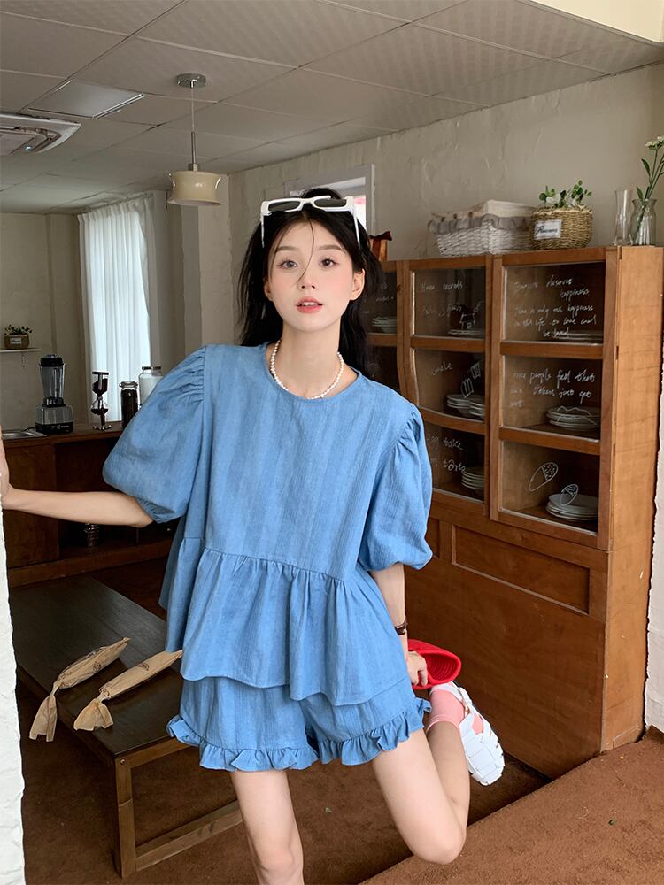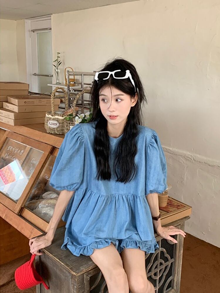 韓国風の女の子デニムスーツ女性の2022年夏新作パフスリーブトップスワイドレッグショーツツーピース潮 サマー 夏物 ブルマー 0921999547835135