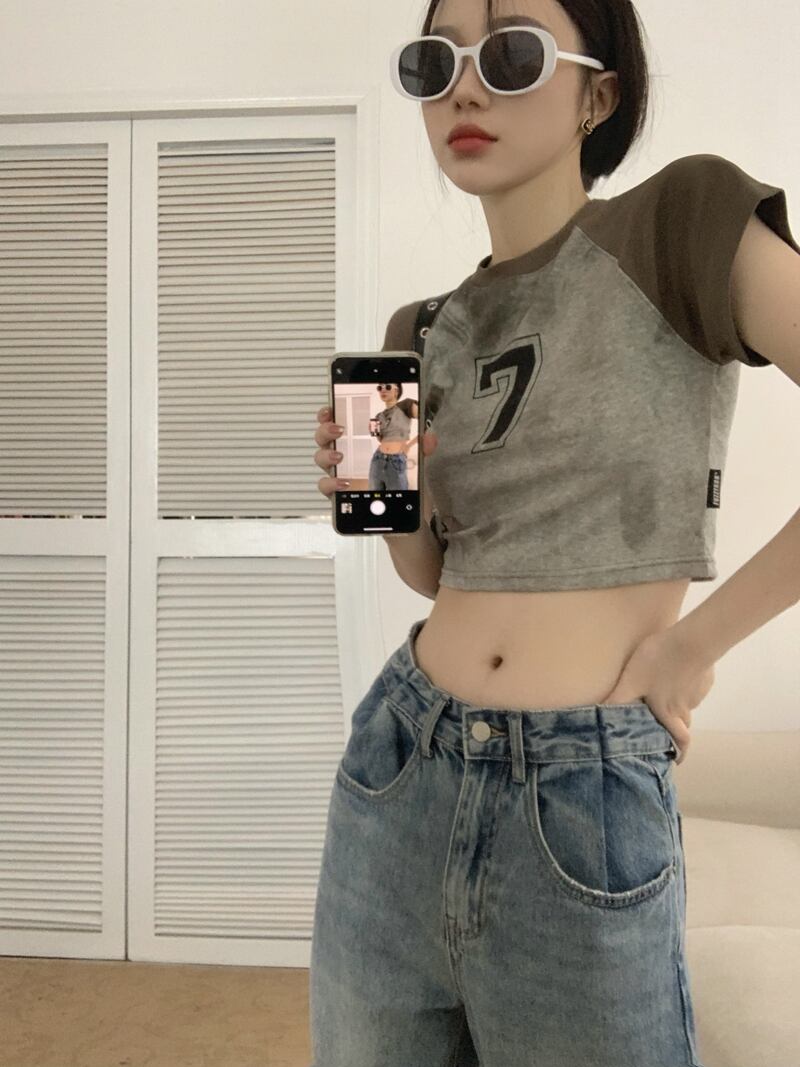 American retro digital printing short-sleeved T-shirt women's summer 2022 new slim short round neck top trendy ショート レトロ サマー 夏物 Oネック スリム Tシャツ 0921970967514862