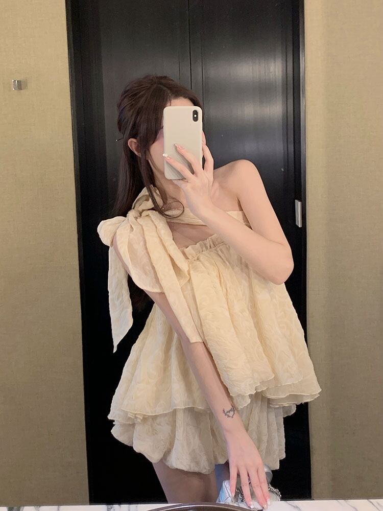 French retro embossed lace-up one-shoulder shirt women's summer 2022 new design pleated short top ショート レトロ レース プリーツ サマー 夏物 レースアップ 0921995470240268