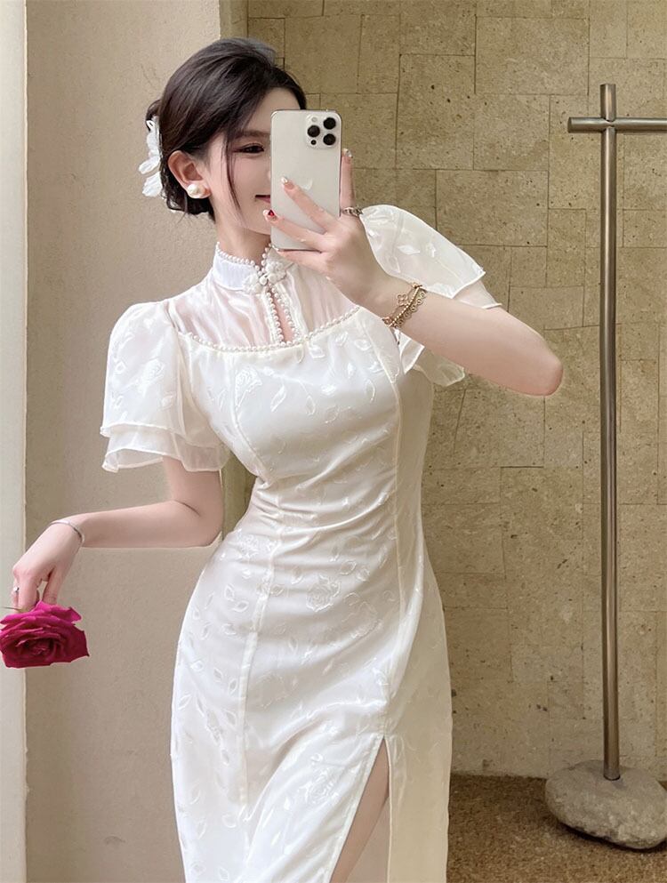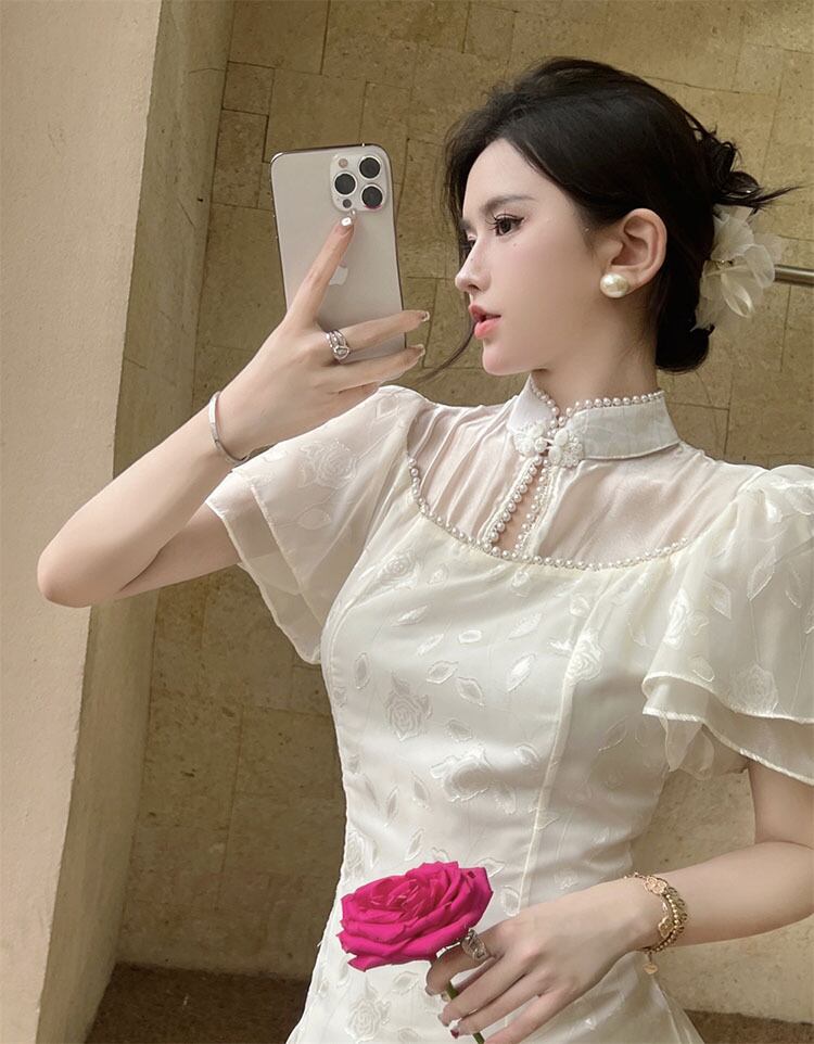 Retro short-sleeved improved cheongsam dress female summer 2022 new waist mid-length fairy split skirt trendy レトロ サマー 夏物 スカート 0921964665918244