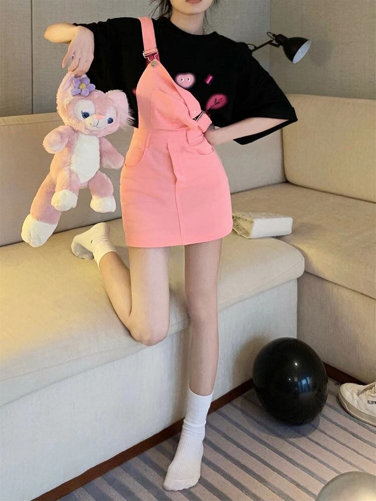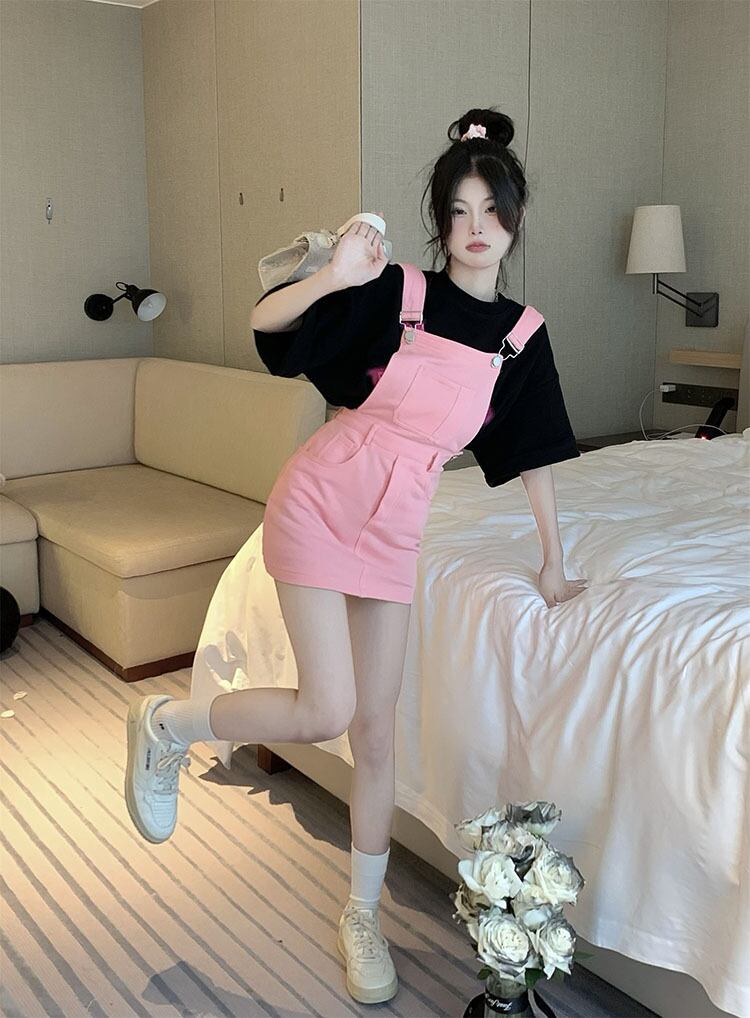 色:ホワイトT-shirtsinglepiece,ブラックt-shirtsinglepiece,ピンクストラップドレス,アプリコットストラップドレス