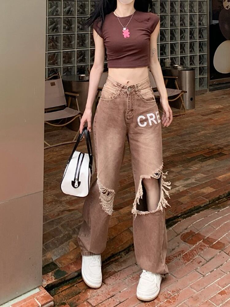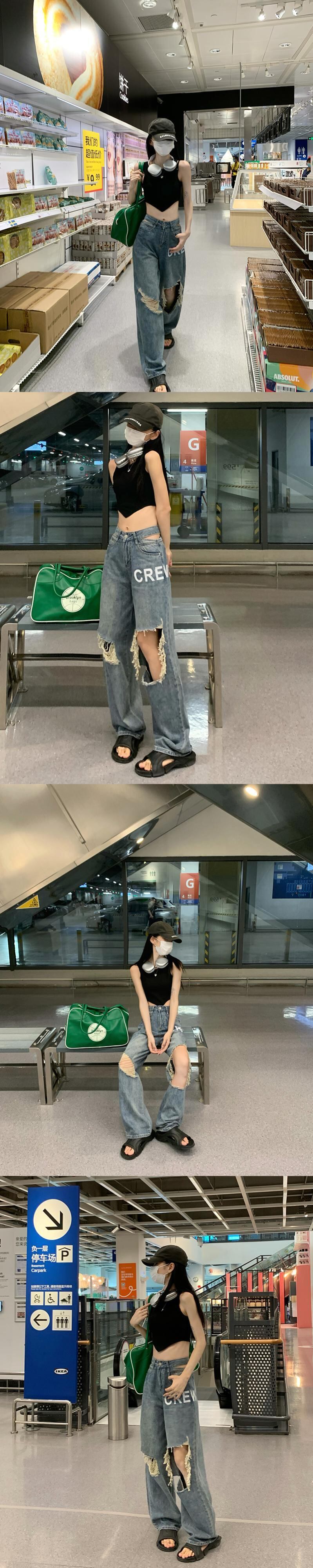 ホットガールシックホールレタープリントハイウエストジーンズ女性の2022年秋の新しいウォッシュモップワイドレッグパンツ潮 オータム 秋物 0921936036713998