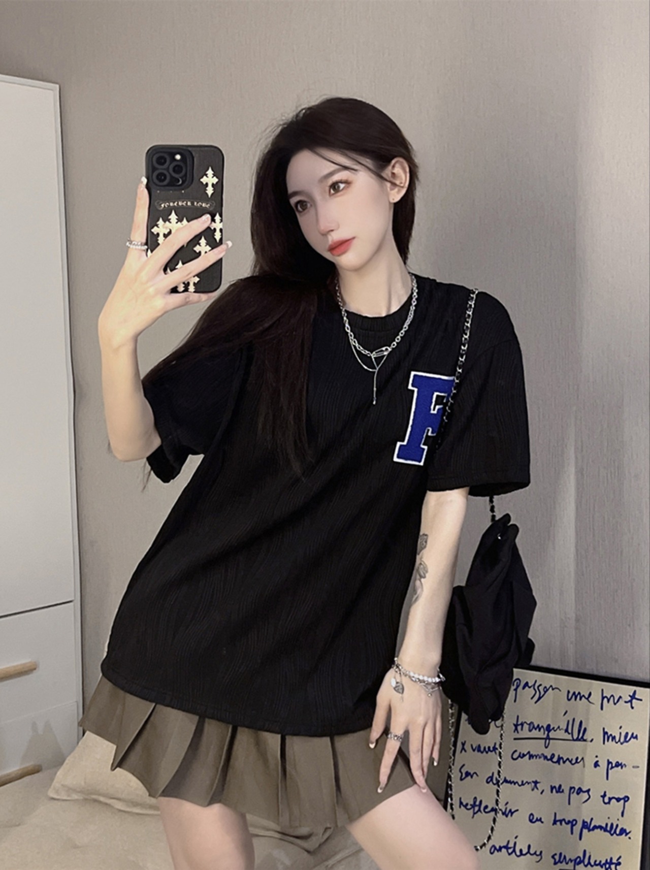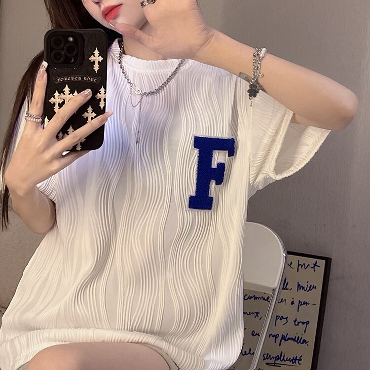 アメリカンレター刺繍半袖Tシャツレディース2022年夏新作デザインゆったりミドル丈白トップストレンド ホワイト サマー 夏物 092191417986486