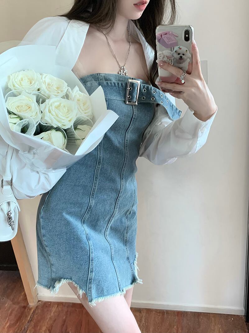 純粋な欲望ホットガールシックなデニムチューブトップドレス女性の夏 2022 新気質生エッジウエストバッグヒップスカート サマー 夏物 0921947892647912