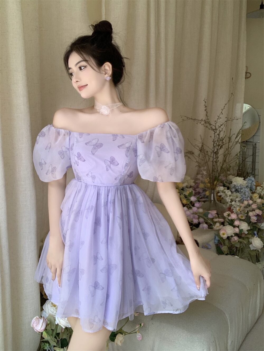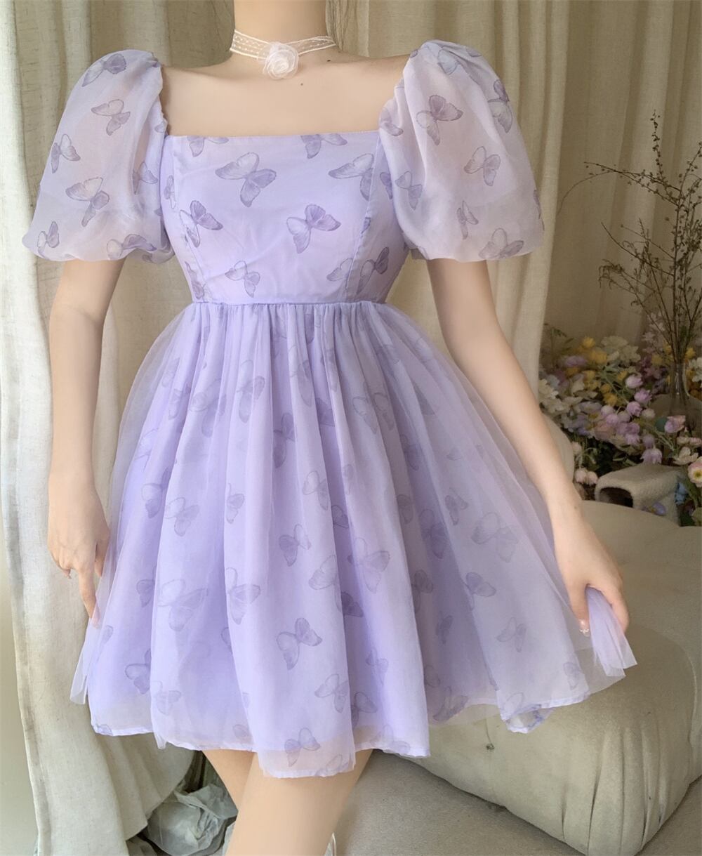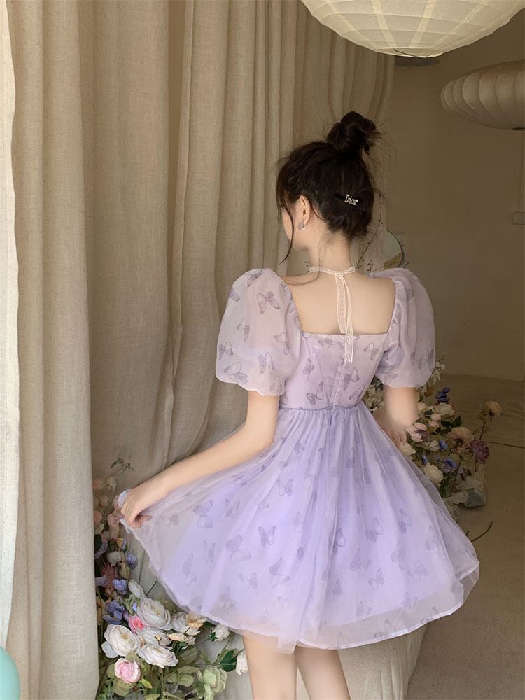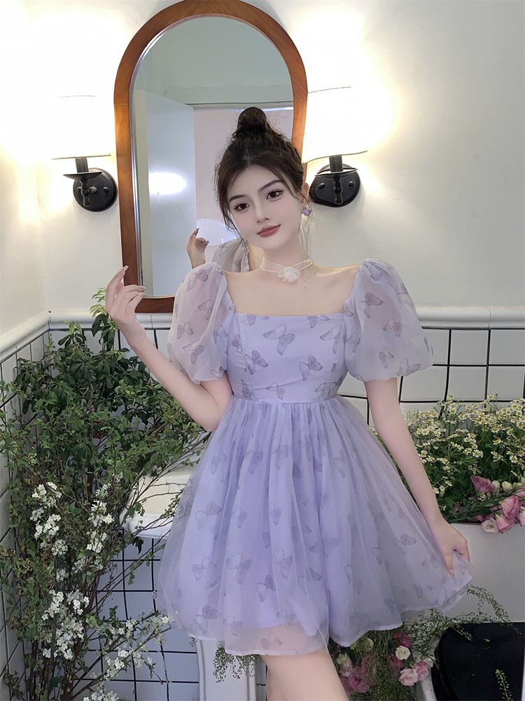 優しい風紫蝶パフスリーブドレスの女性の夏 2022 新しいフレンチプリーツウエストふくらんスカート サマー 夏物 パープル 0921976335950425