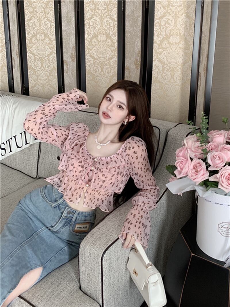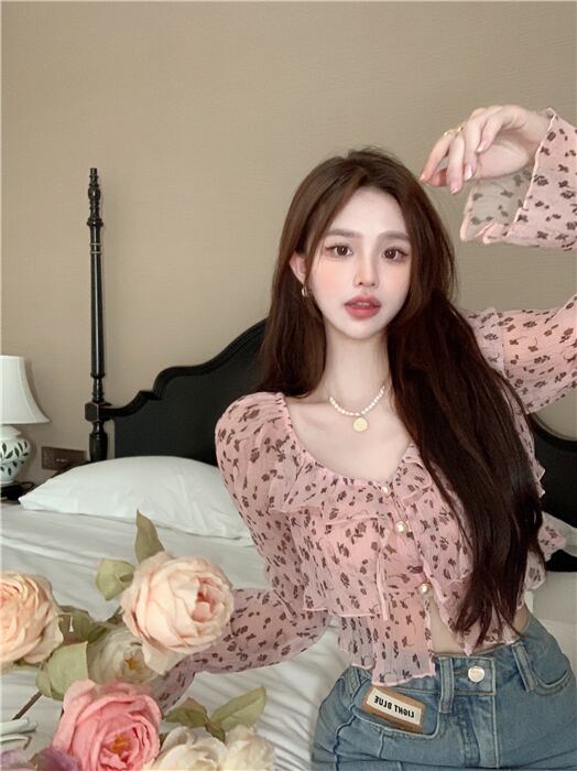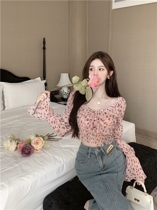 French Floral One-Shoulder Top Women's Autumn 2022 Chic Slim Short Flared Sleeve Shirt ショート レッド オータム 秋物 花柄 スリム 0921925840831151