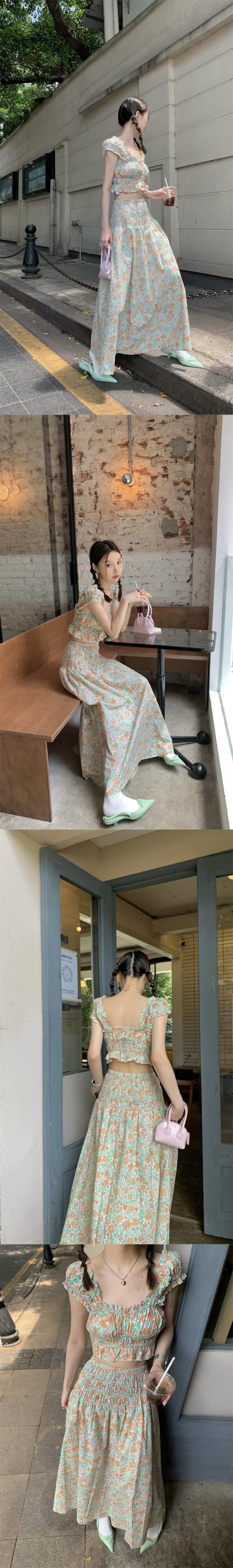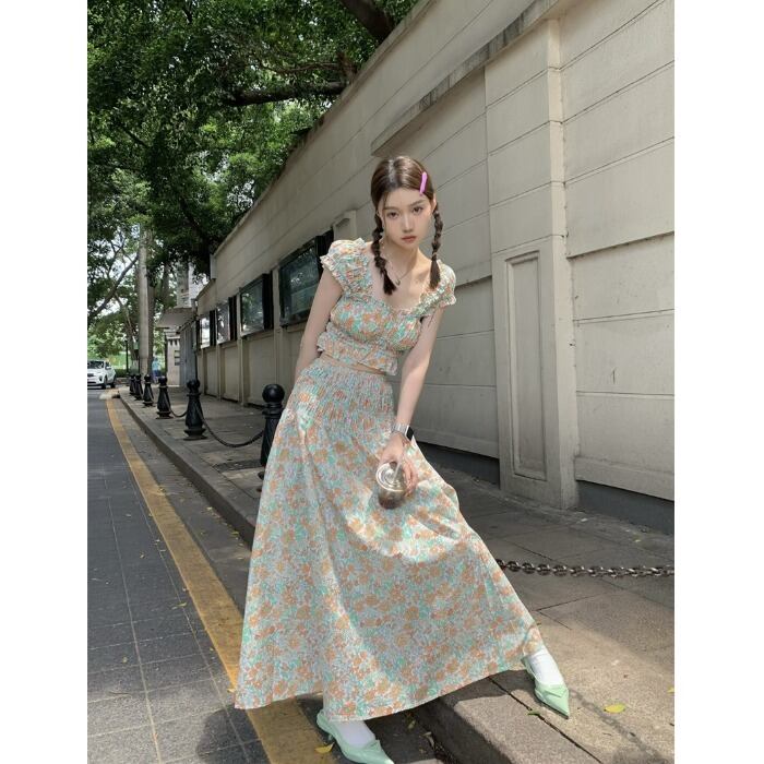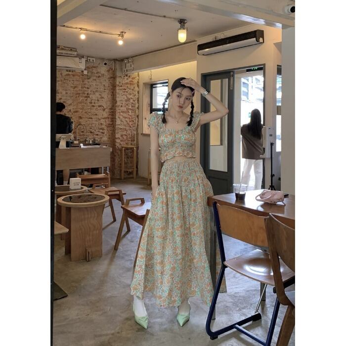 French floral suit women's summer 2022 new eign style fungus fringed pleated vest skirt fashion two-piece set プリーツ サマー 夏物 花柄 スカート 0921926313715312