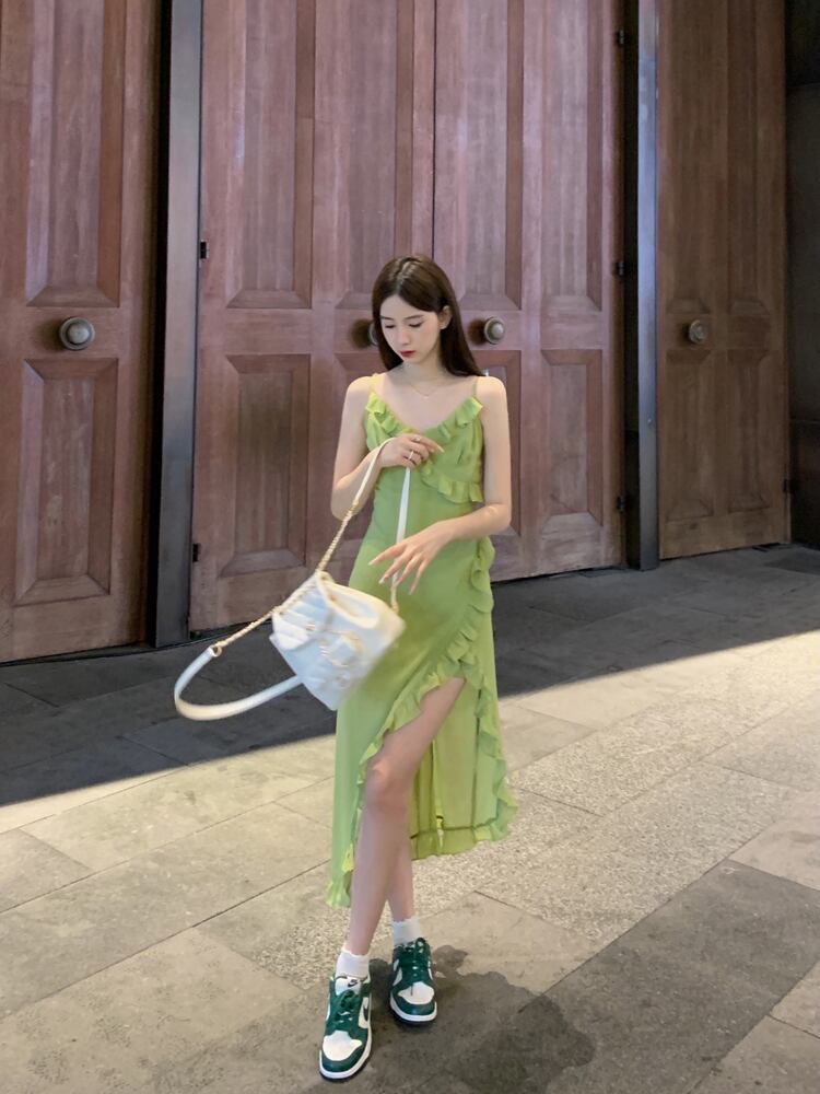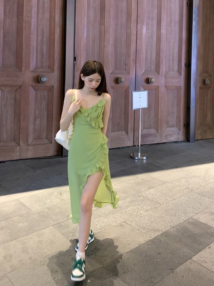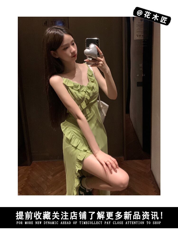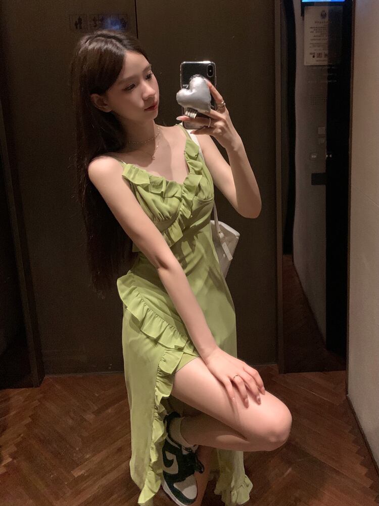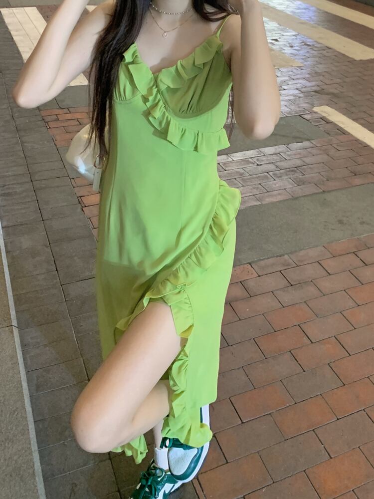 甘くてスパイシーな緑のフリル V ネック サスペンダー ドレス女性の 2022 年夏新しい気質ウエスト スリット スカート 大人ガーリー スウィート キュート カジュアル サマー 夏物 Vネック グリーン 0921955601349903