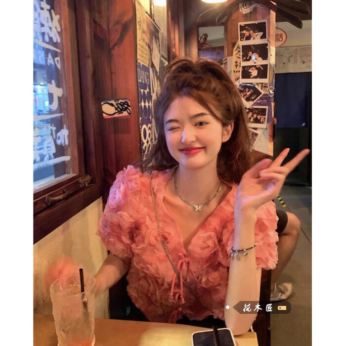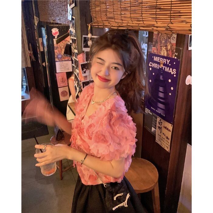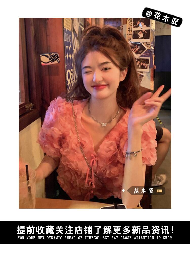 Atmosphere sweet three-dimensional flower V-neck shirt women's summer 2022 new temperament lace-up short top ショート レース 大人ガーリー スウィート キュート カジュアル サマー 夏物 Vネック レースアップ フラワーデザイン 0921968943667871