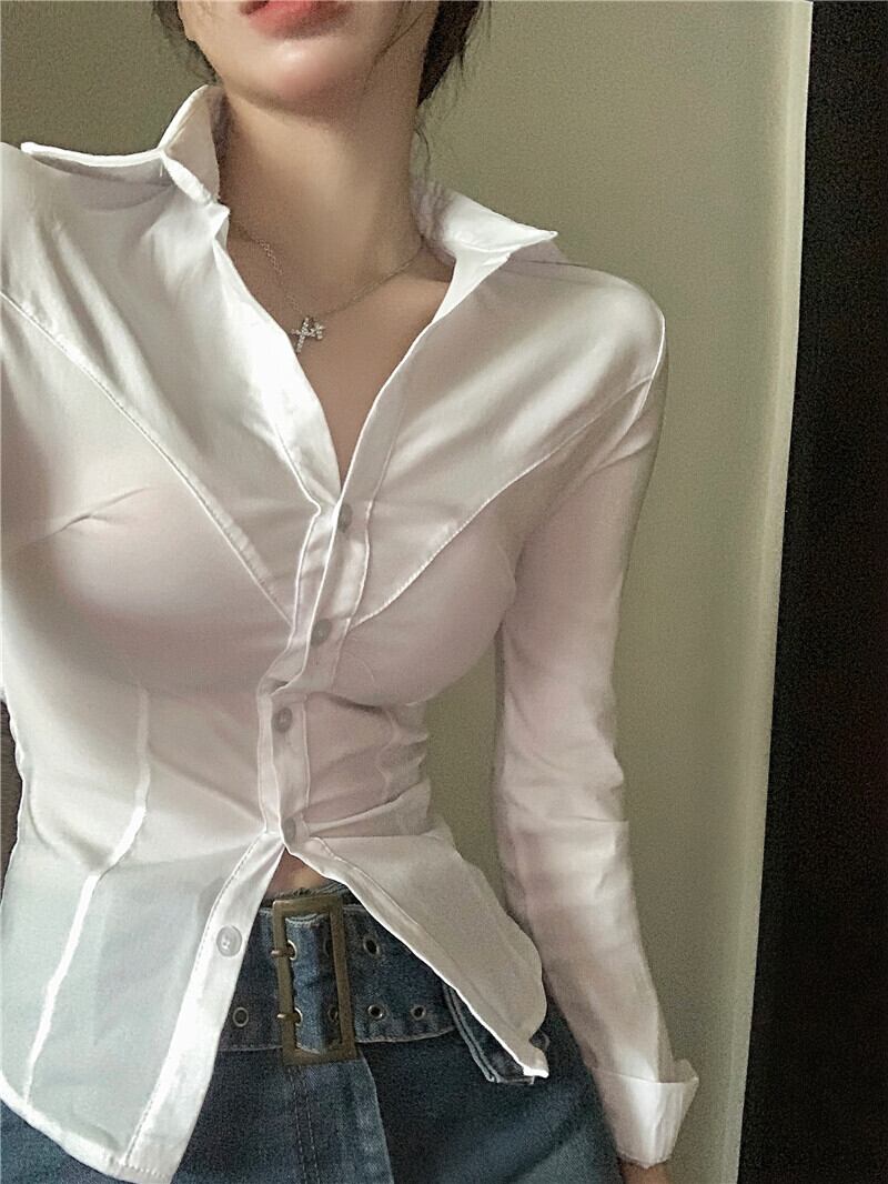 純粋な欲望 V ネック タイト フィット長袖白シャツ女性 2022 年初秋の新しいデザイン センス ホット ガール気質薄いトップ ロング ホワイト オータム 秋物 Vネック 0921975311946123