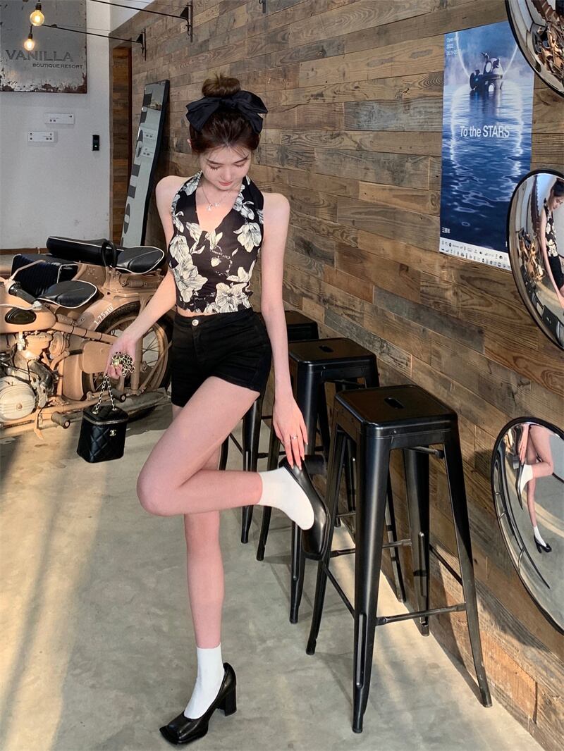 Retro design sense print halter vest women's summer 2022 new V-neck short outer wear halter top ショート レトロ サマー 夏物 Vネック 0921941632188750