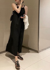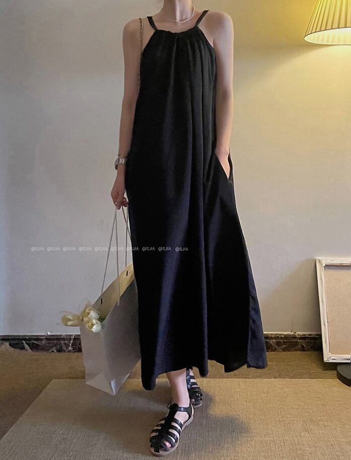 chic niche drawstring suspender dress women's summer 2022 new mid-length loose temperament little black dress ブラック サマー 夏物 0921965757573919