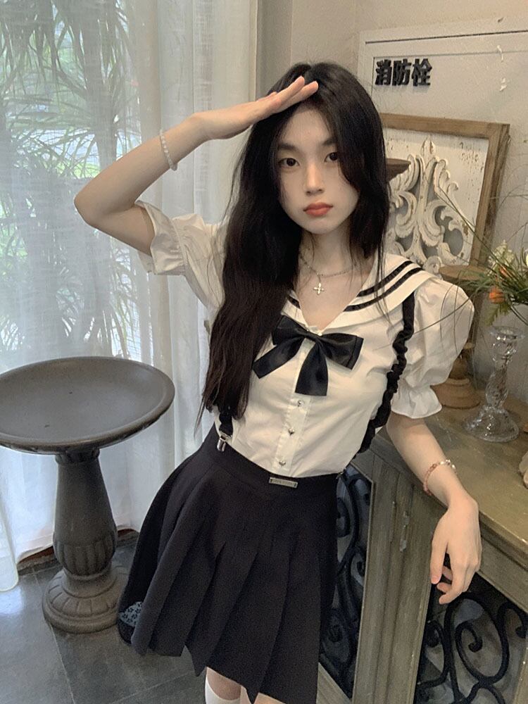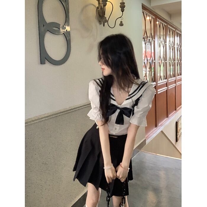 style fashion age-reducing suit female summer 2022 new chic navy collar shirt pleated skirt two-piece set プリーツ サマー 夏物 スカート 0921944785054902