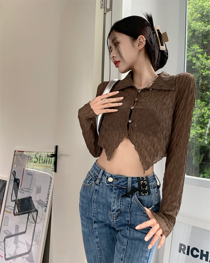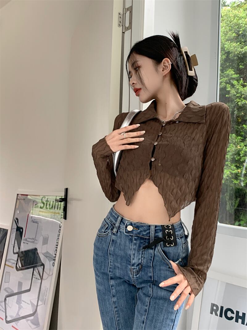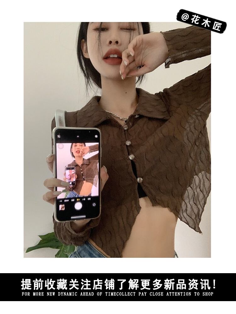 French retro irregular long-sleeved shirt women's 2022 early autumn new design sense Polo collar short cardigan top ショート ロング レトロ カーディガン オータム 秋物 09219907967314