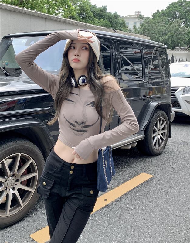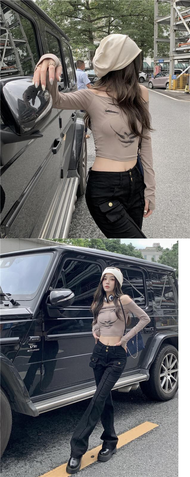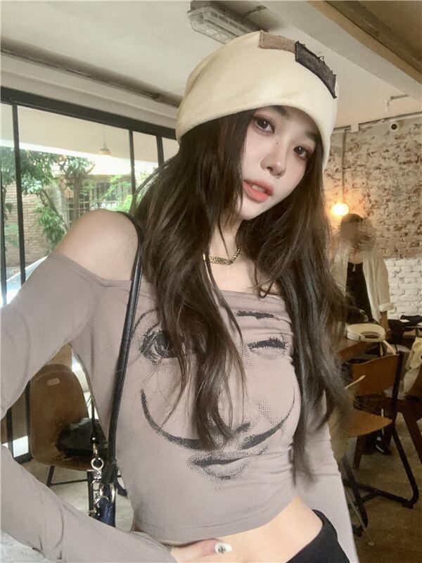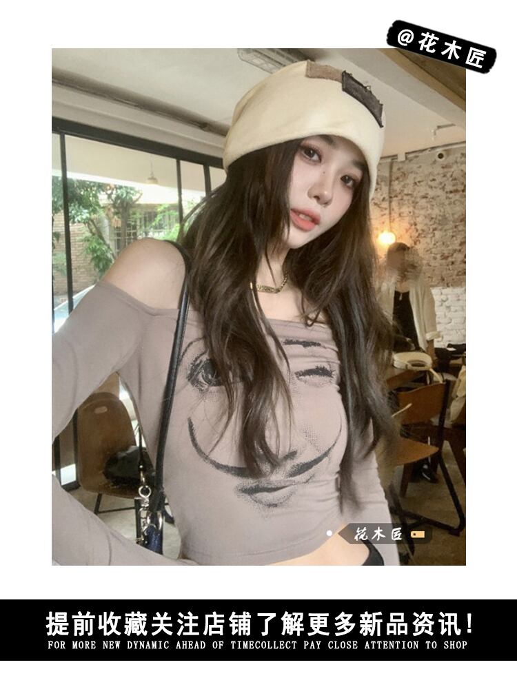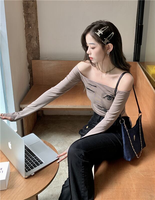 sense off-the-shoulder chic print slim long-sleeved T-shirt women's autumn 2022 new temperament short top ショート ロング オータム 秋物 スリム Tシャツ 0921945742375938
