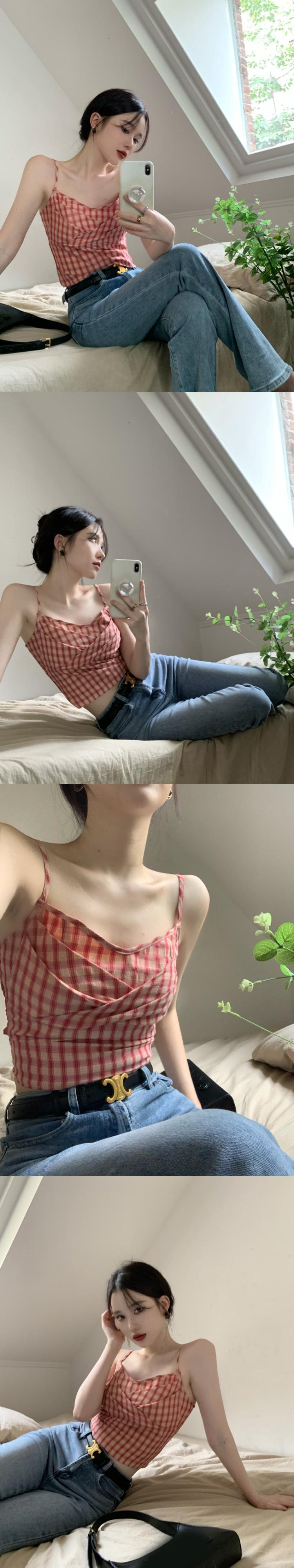 Retro red plaid camisole women's outer wear trendy summer 2022 new pleated v-neck slim short top ショート レッド レトロ プリーツ サマー 夏物 Vネック スリム 0921925652562165