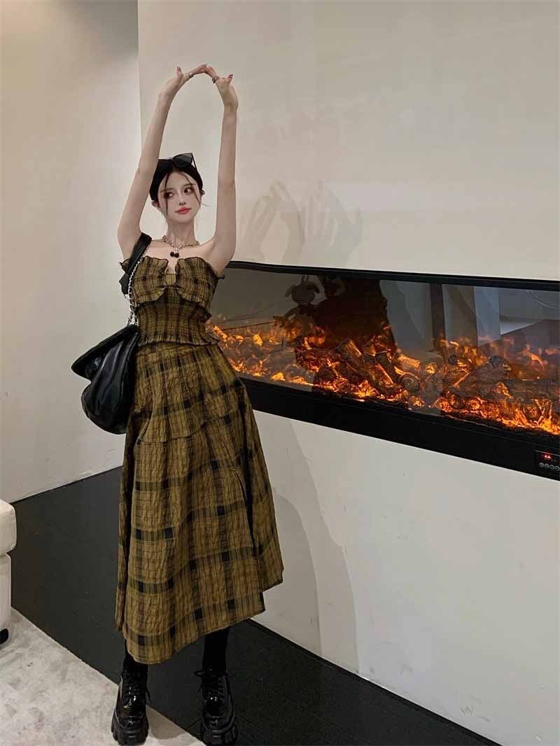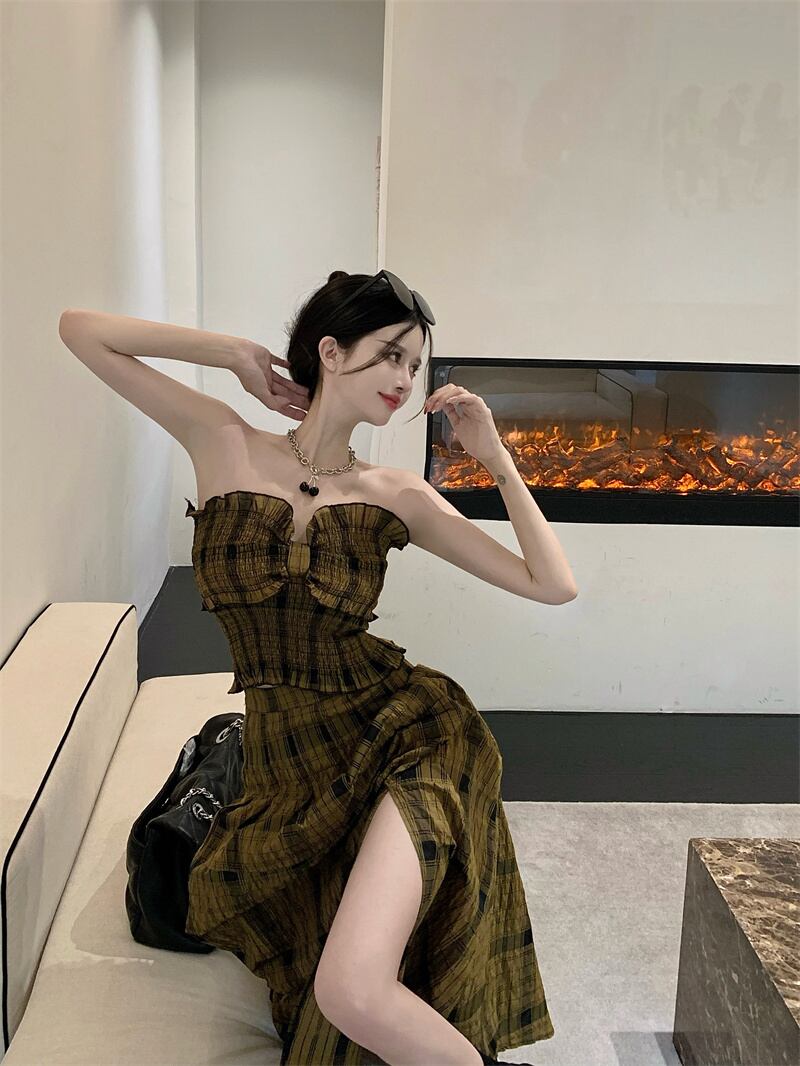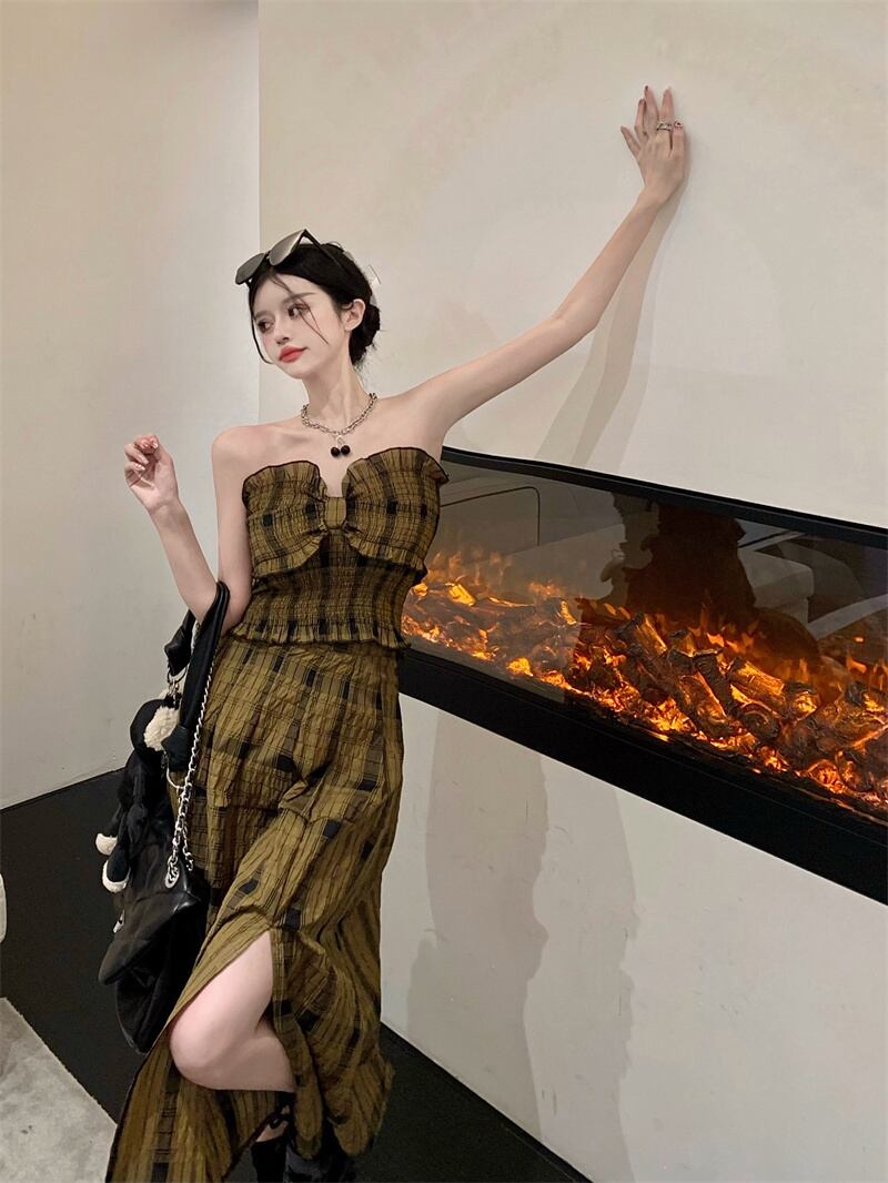 sense plaid suit female summer 2022 new temperament fungus edge tube top split skirt two-piece set サマー 夏物 スカート 0921918055205096