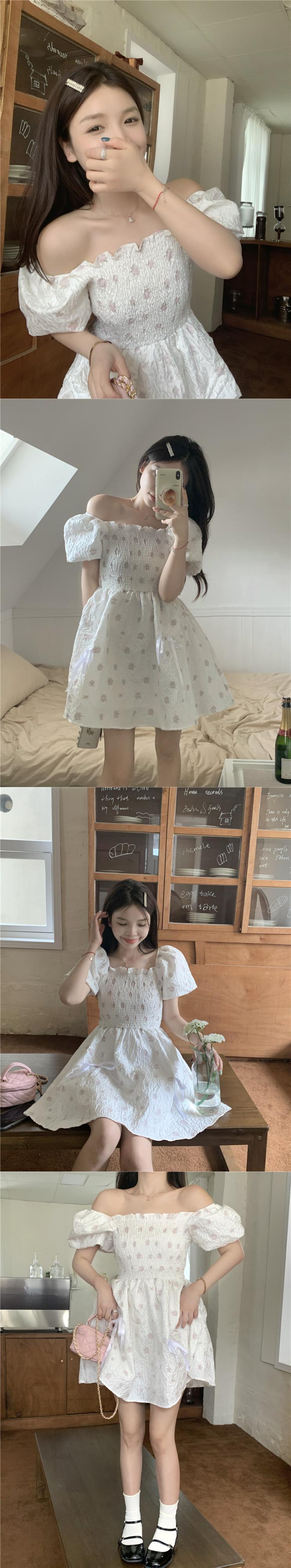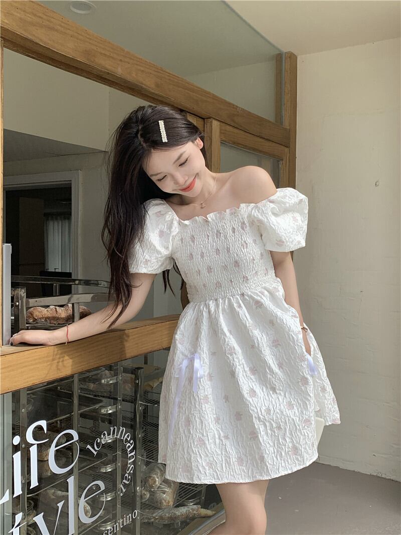 chic sweet flower puff sleeve dress female summer 2022 new temperament waist tutu skirt 大人ガーリー スウィート キュート カジュアル サマー 夏物 スカート パニエ ペチコート フラワーデザイン 0921985737853151