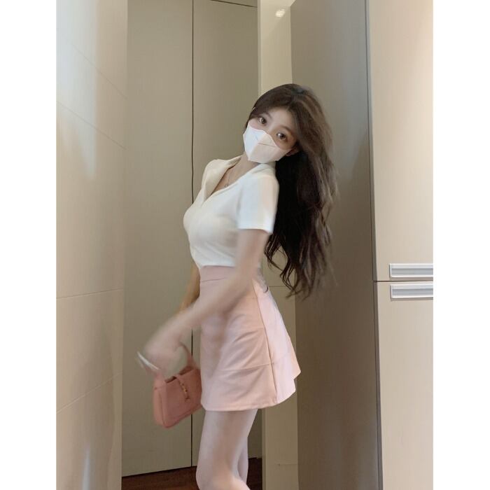 Hot zipper white polo collar short-sleeved T-shirt women's summer 2022 new slim slim chic short top ショート ホワイト サマー 夏物 スリム Tシャツ 0921920075017681