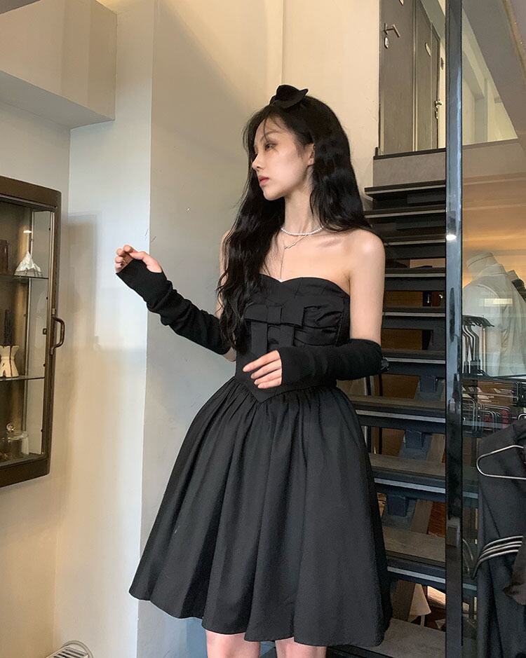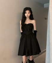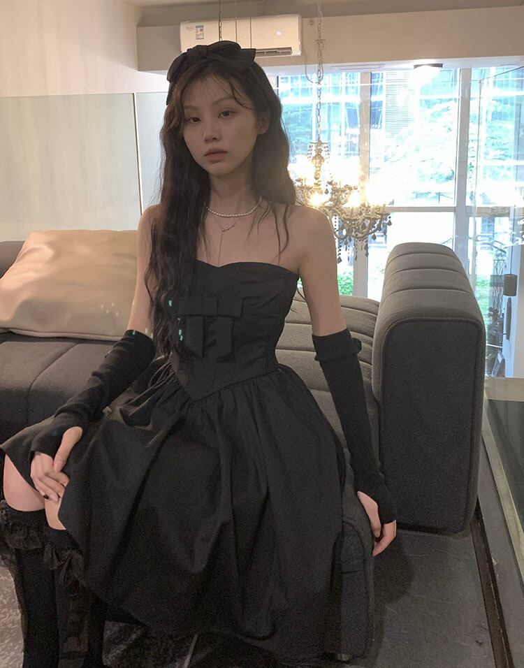 高品質の黒の弓チューブ トップ ドレス女性の 2022 年夏新しいシックなプリーツ ウエスト A ライン スカート ブラック リボン サマー 夏物 Aライン 0921969432822765